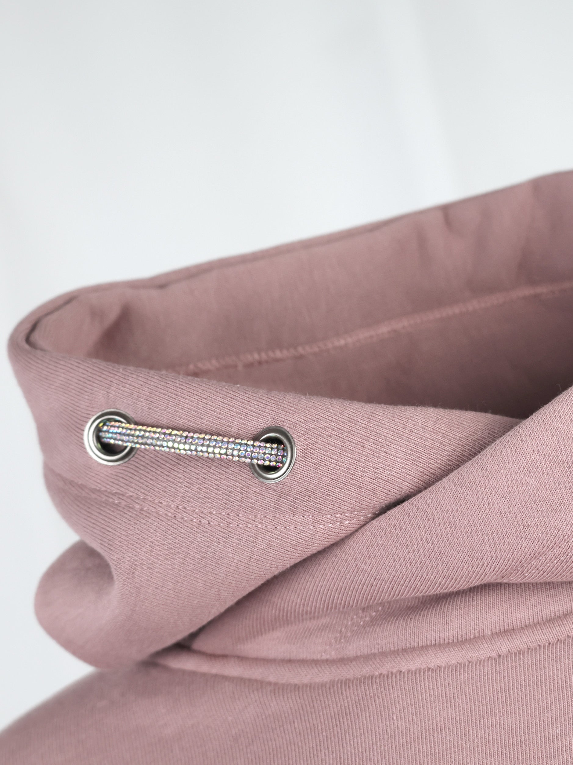 Beautifully tailored cross-neck hoodie featuring luxurious rhinestone-detailed hood laces.