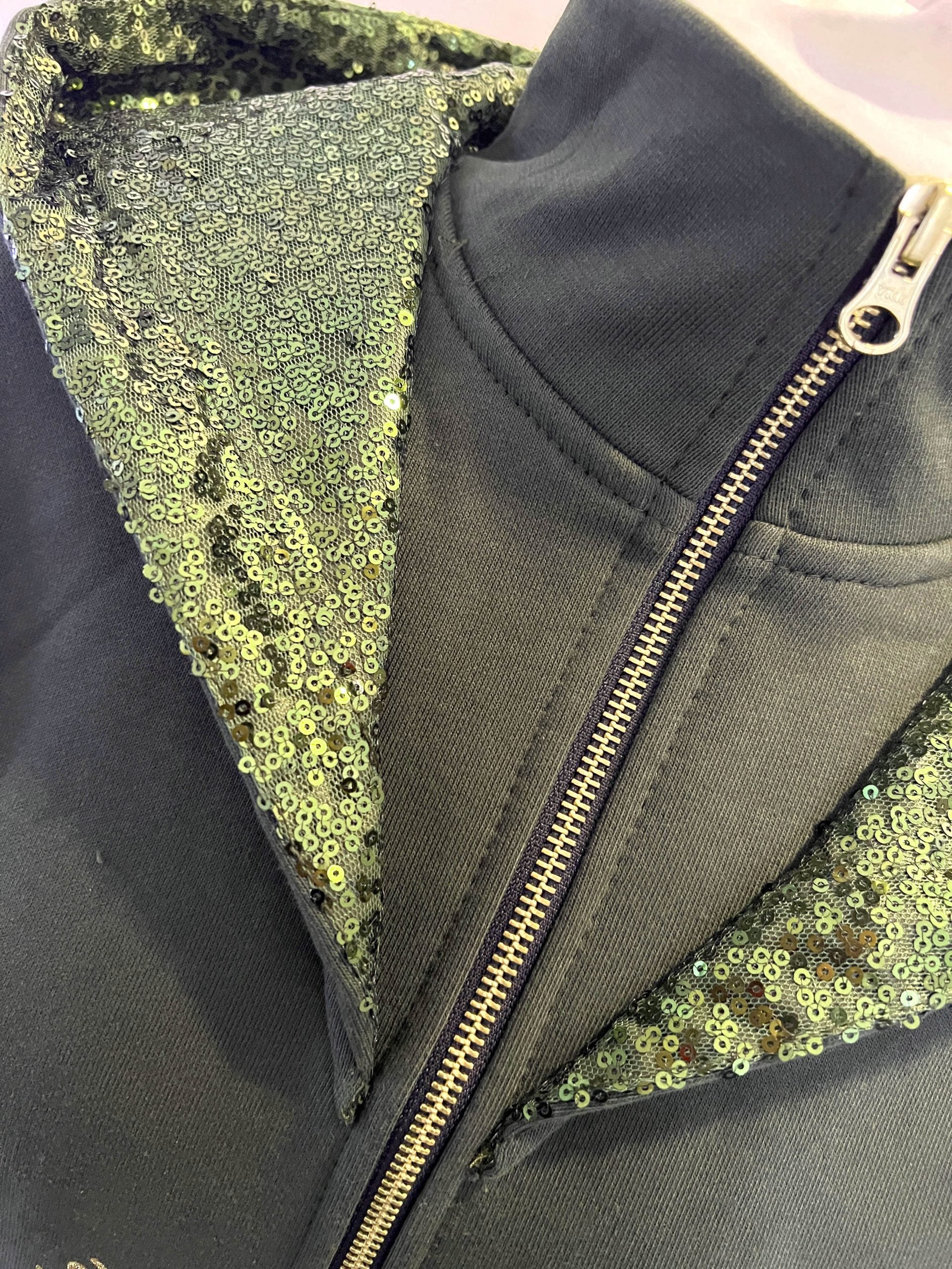 Finished in Olive with full zip and exquisite large hood unique design. Black sequin details in hood and pockets.