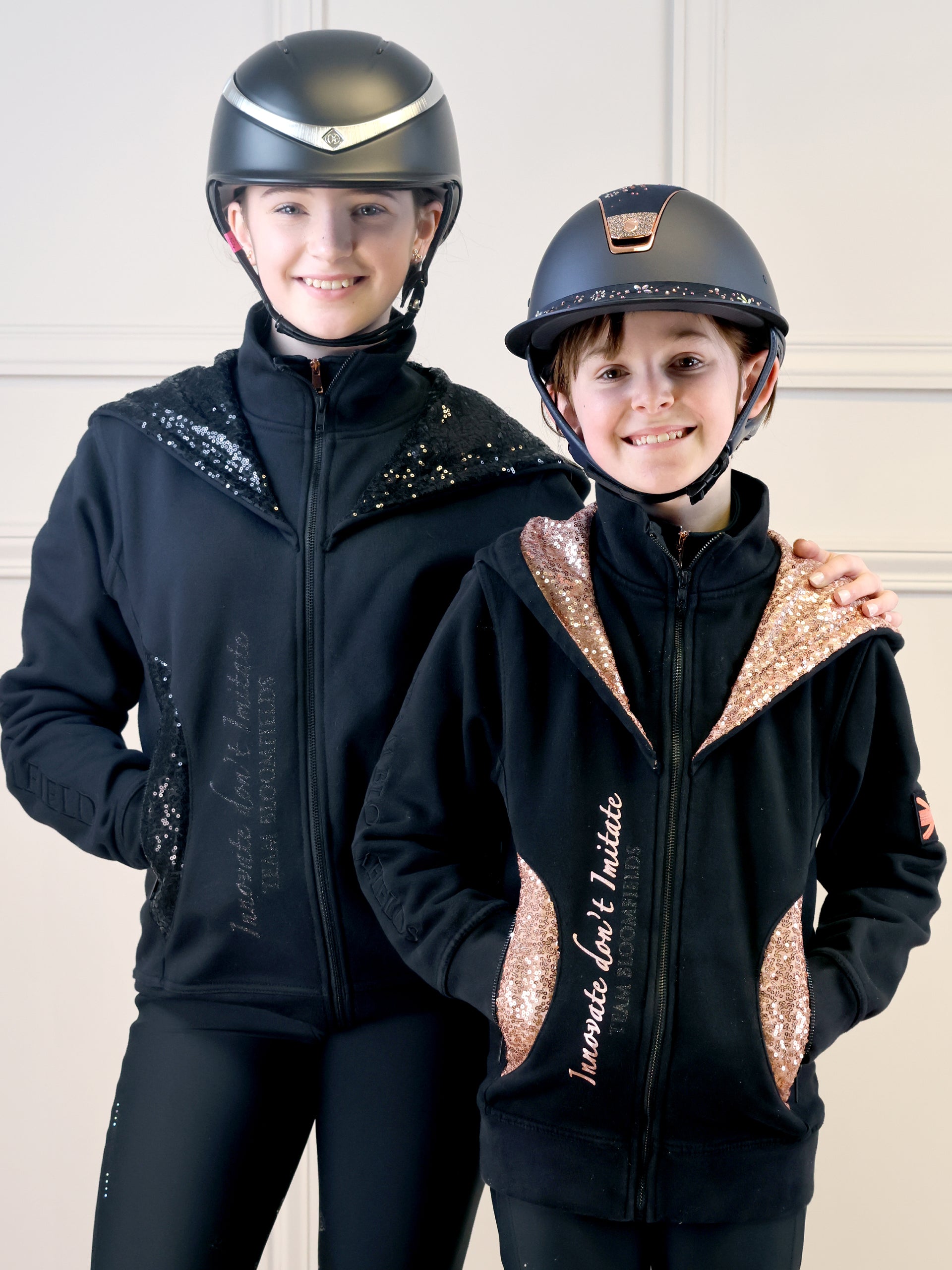 Finished in Black with full zip and exquisite large hood unique design. Rose Gold sequin details in hood and pockets.