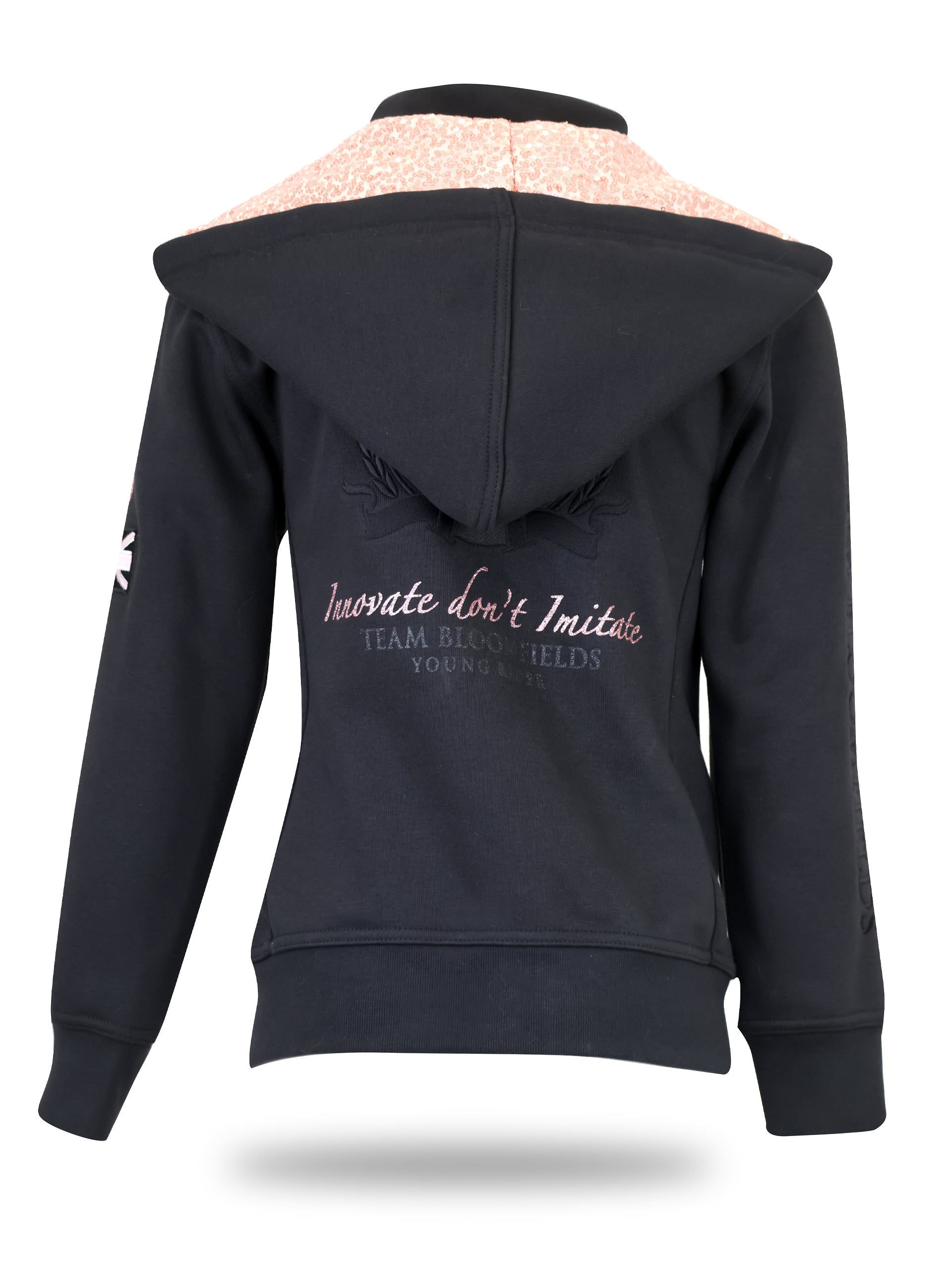 At the front, the signature “Innovate Don’t Imitate” slogan sits alongside the zip in striking black glitter, adding a bold yet stylish touch. The reverse showcases Team Bloomfields lettering with an embroidered logo and a rhinestone ‘B’ for a subtle hint of glamour.