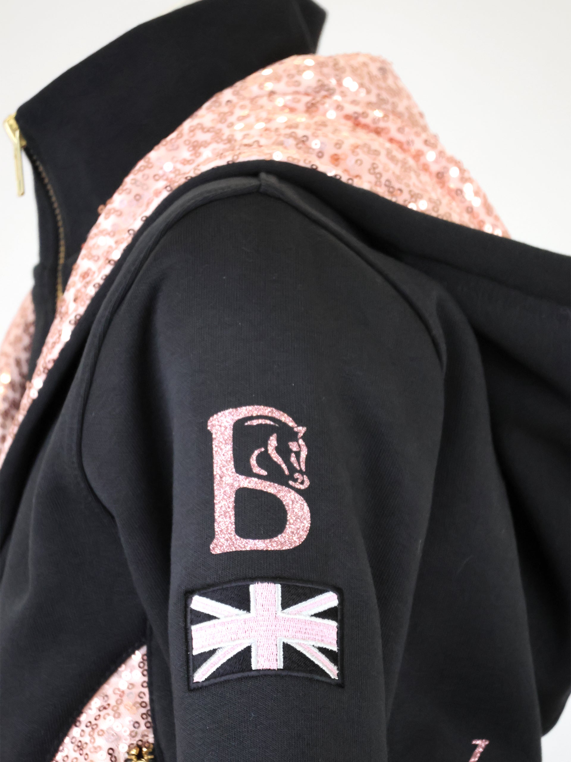 Subtle rose gold sequin detailing inside the hood and on the pockets adds a touch of sparkle while keeping the overall look refined and elegant. The hoodie features beautifully embroidered Team Bloomfields branding on one sleeve, with the iconic Bloomfields ‘B’ logo on the opposite sleeve, finished with a Union Jack detail beneath for an extra statement of pride.