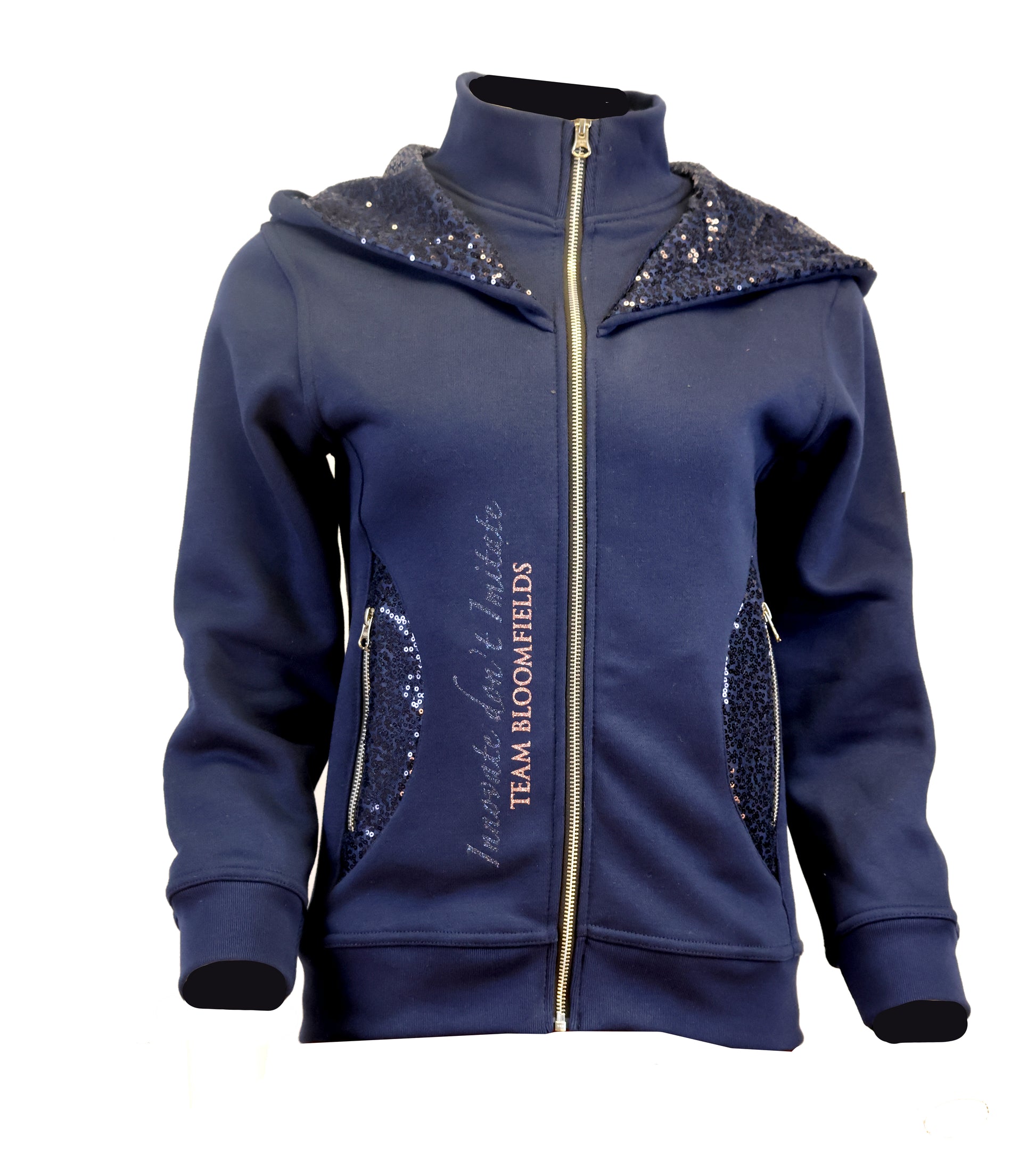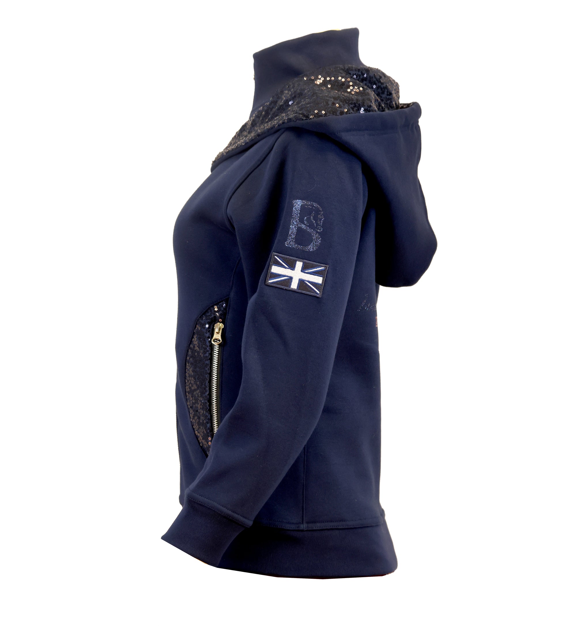 Finished in navy with navy with full zip and exquisite large hood unique design. Black sequin details in hood and pockets.