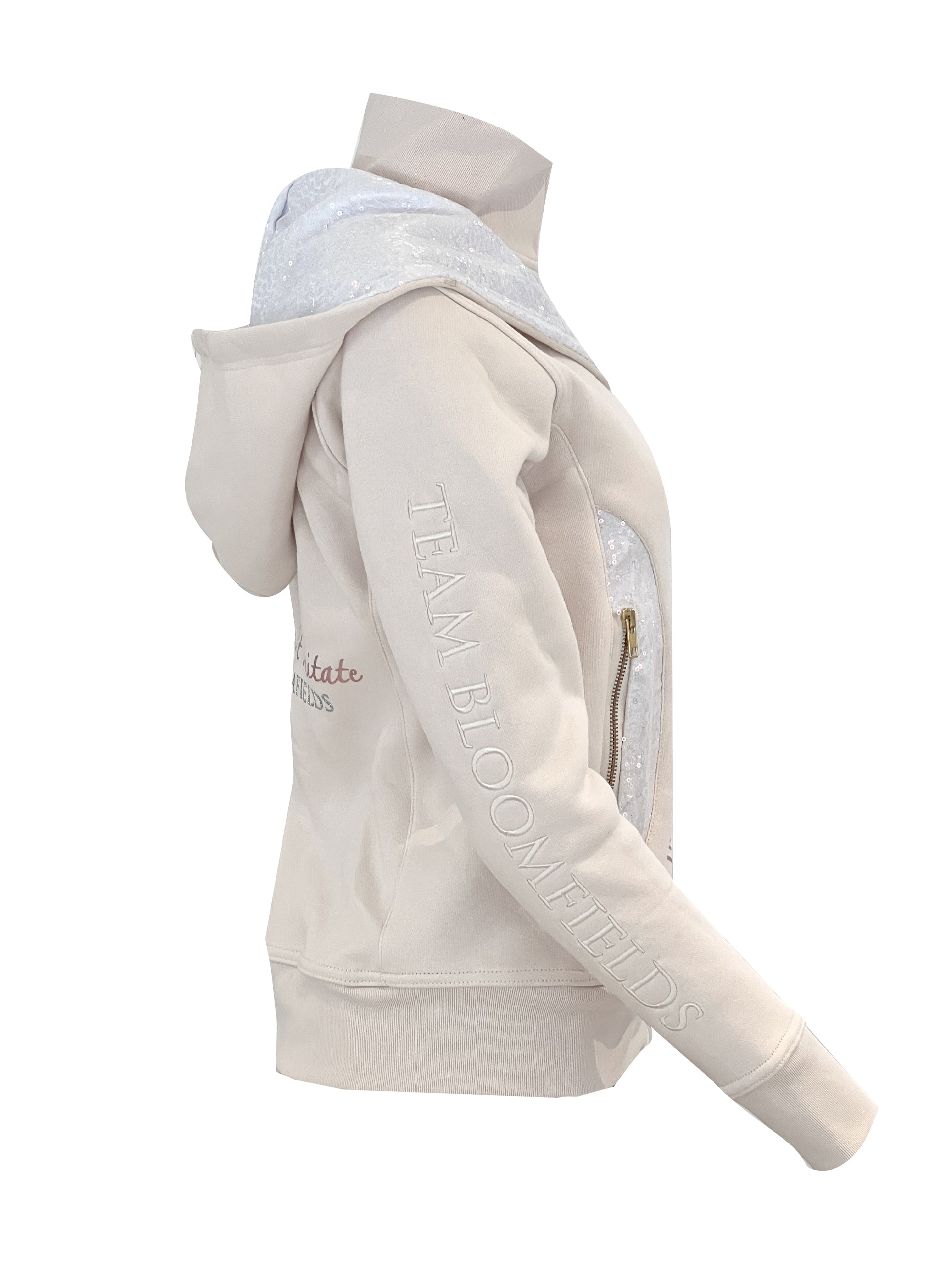 Finished in winter white with full zip and exquisite large hood unique design. Black sequin details in hood and pockets.