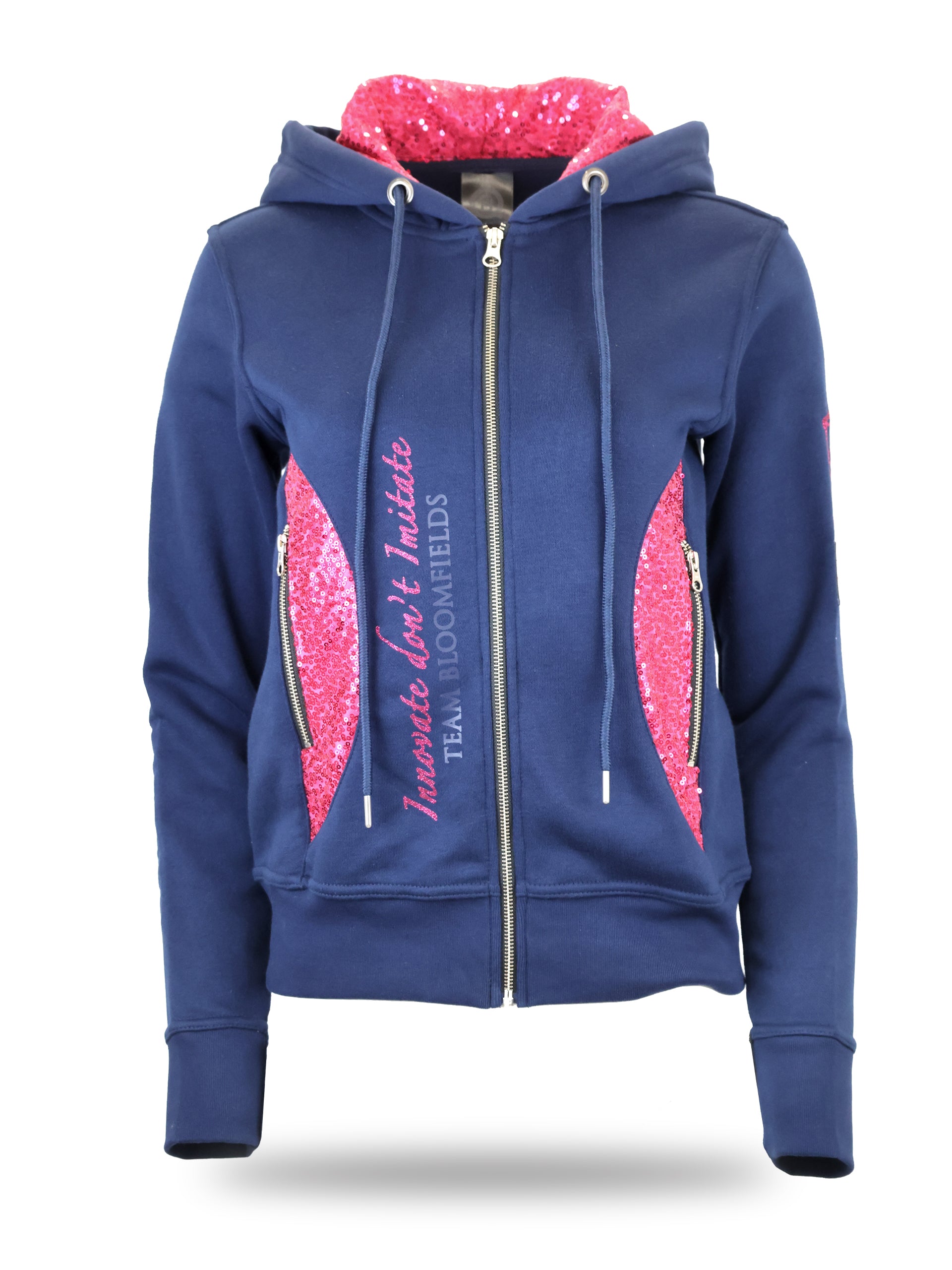At the front, the signature “Innovate Don’t Imitate” slogan sits beside the zip in vibrant hot pink, adding a striking and confident detail. The reverse is finished with Team Bloomfields lettering and a sparkling rhinestone ‘B’ logo for the perfect finishing touch.