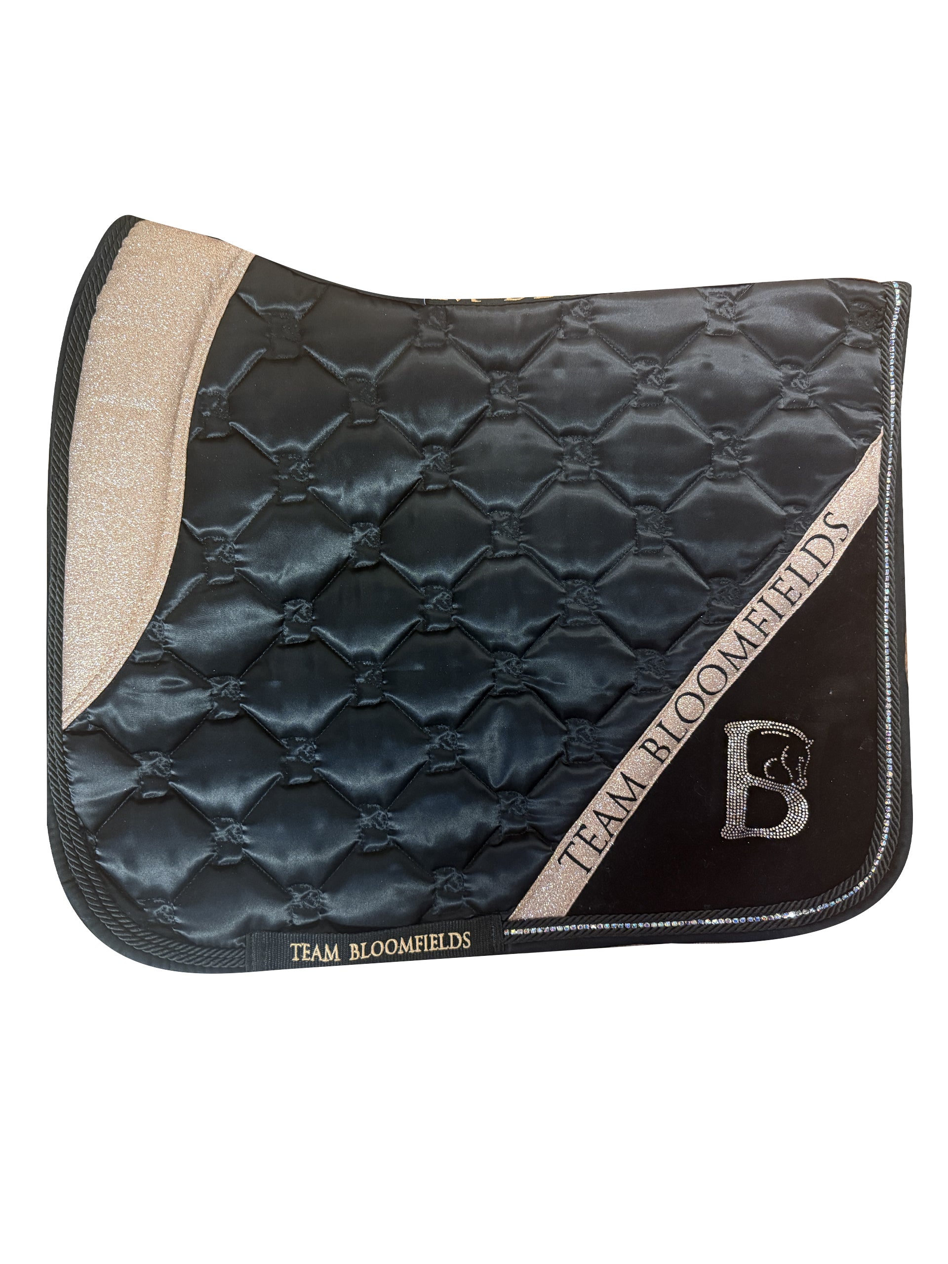 Black & sparkle rose gold dressage saddle pad.