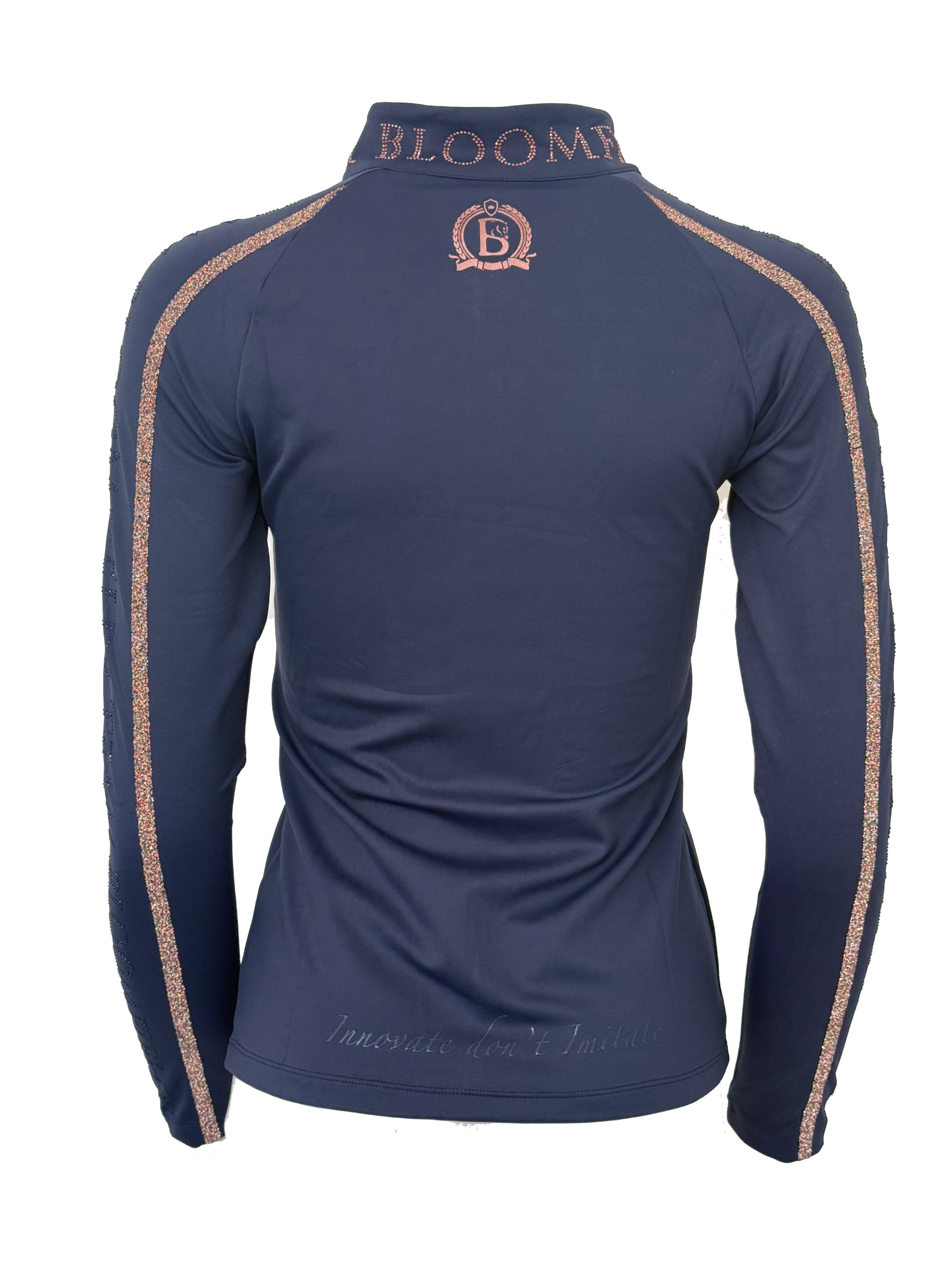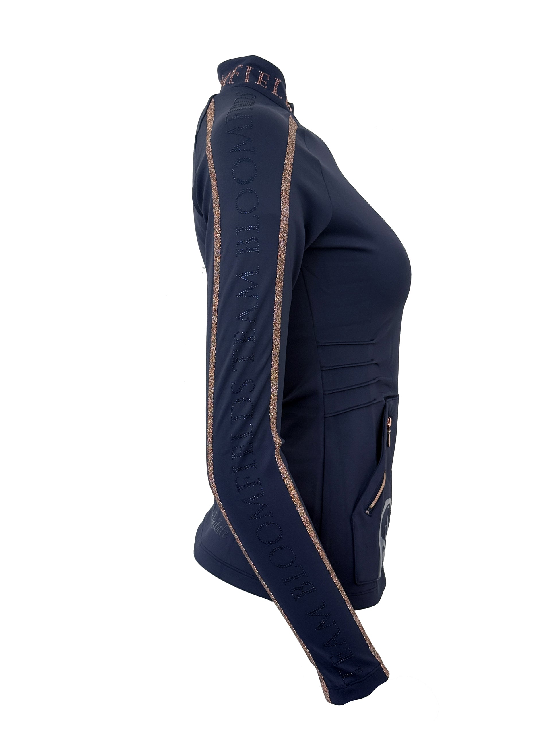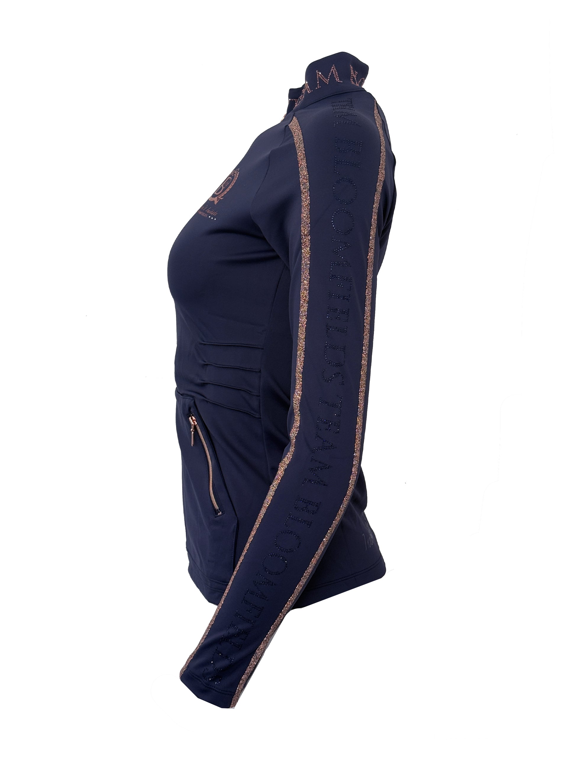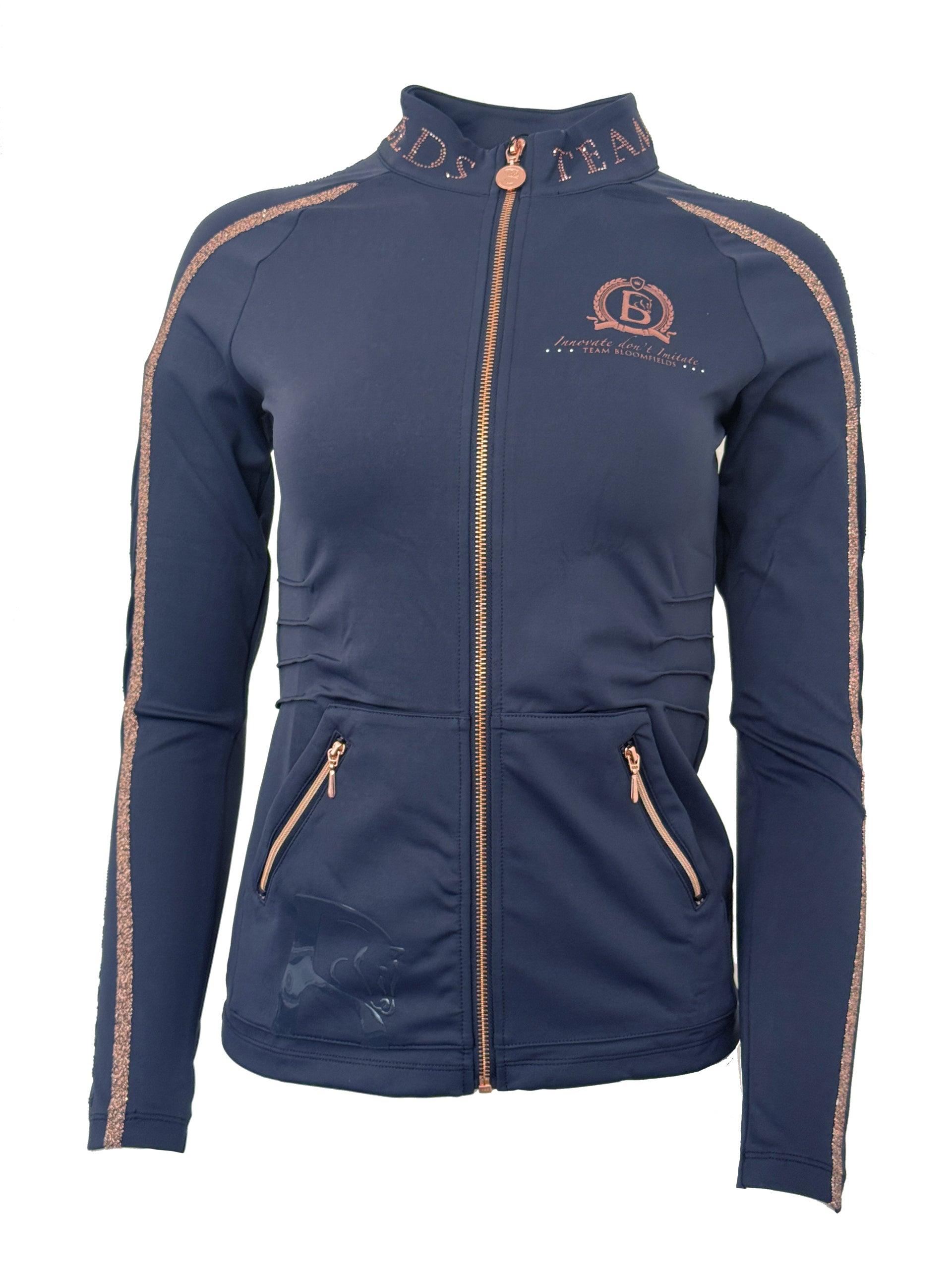 Finished in navy with rose gold with full zip and exquisite high neck design with Team Bloomfields in Rose Gold Rhinestone around the neck