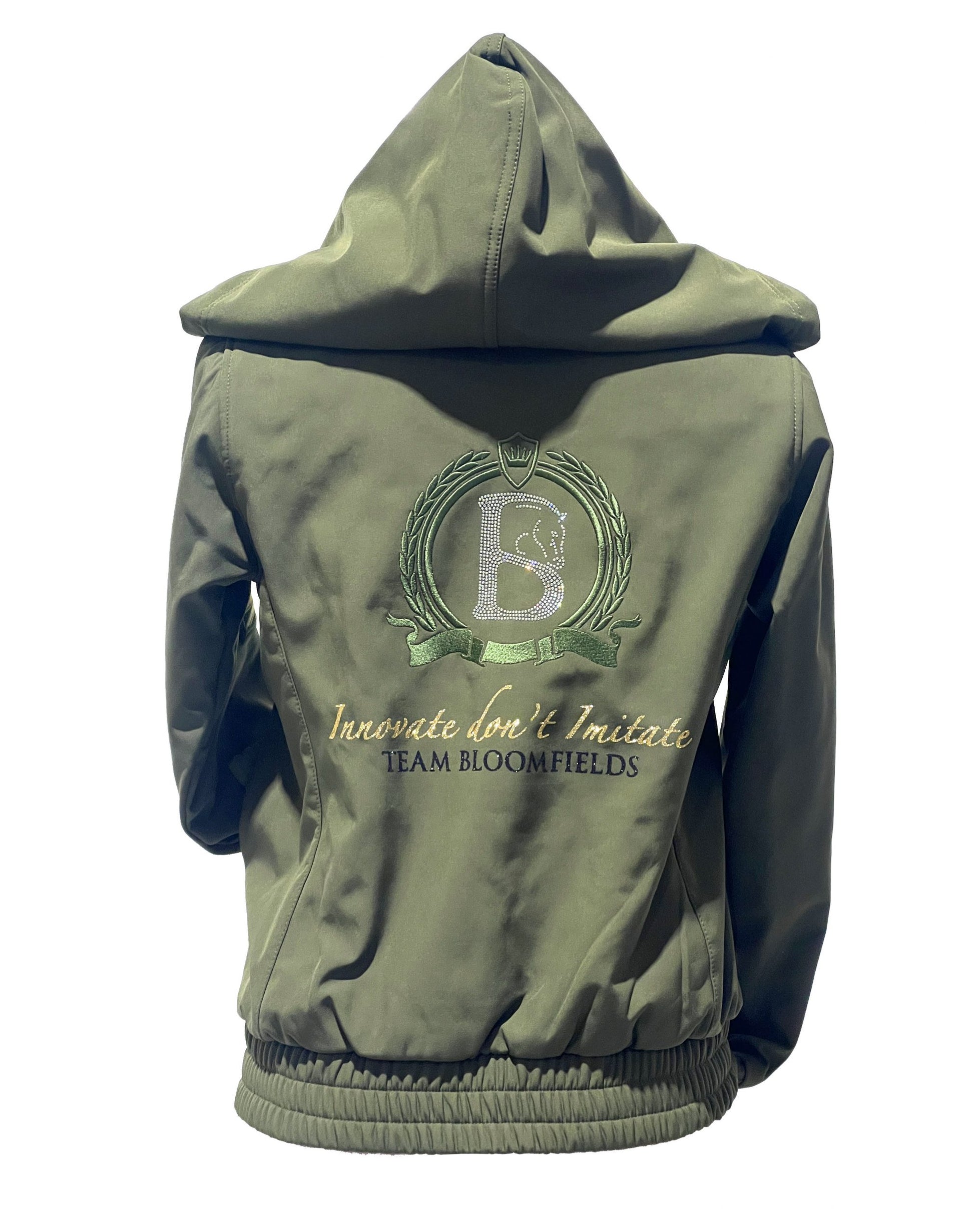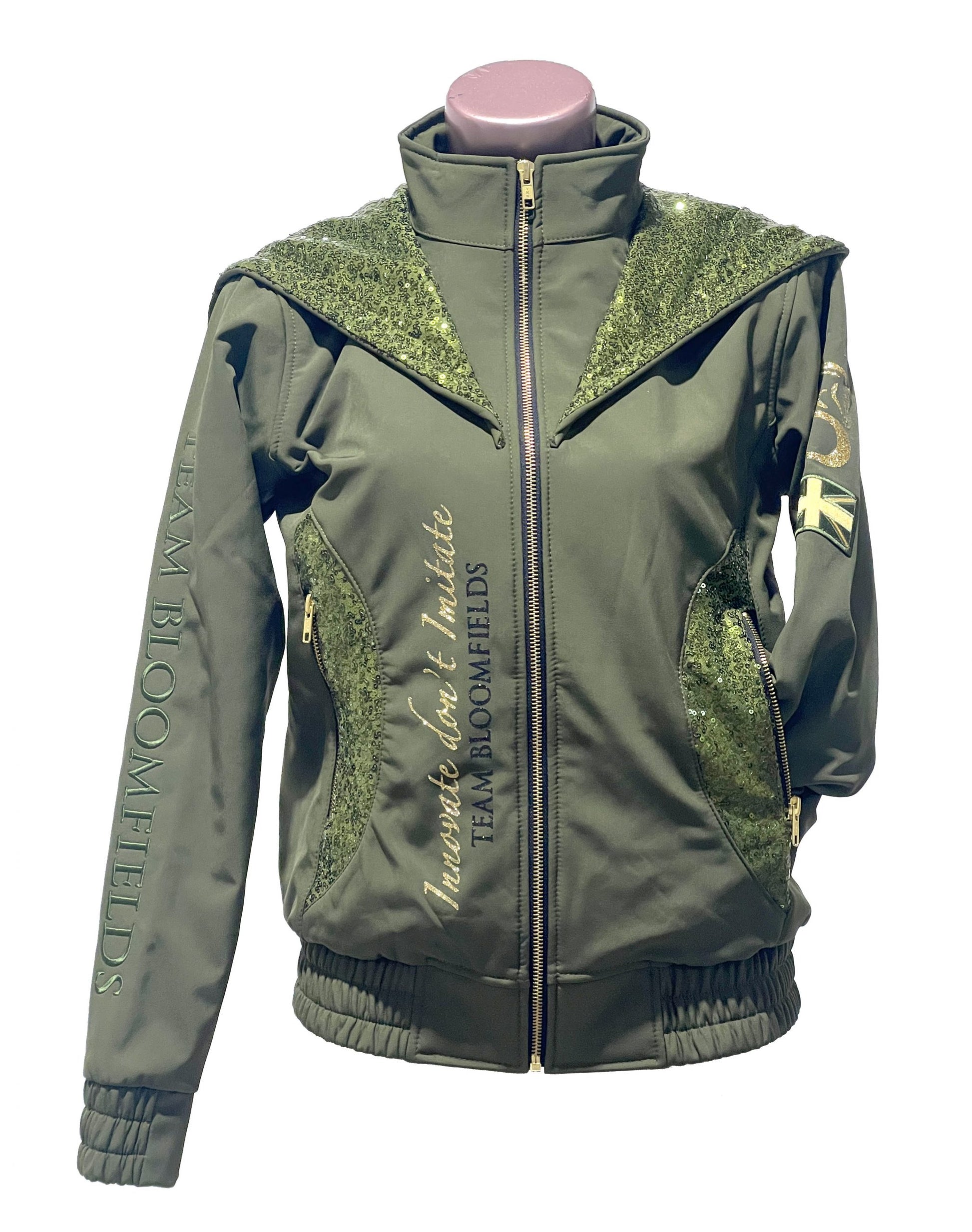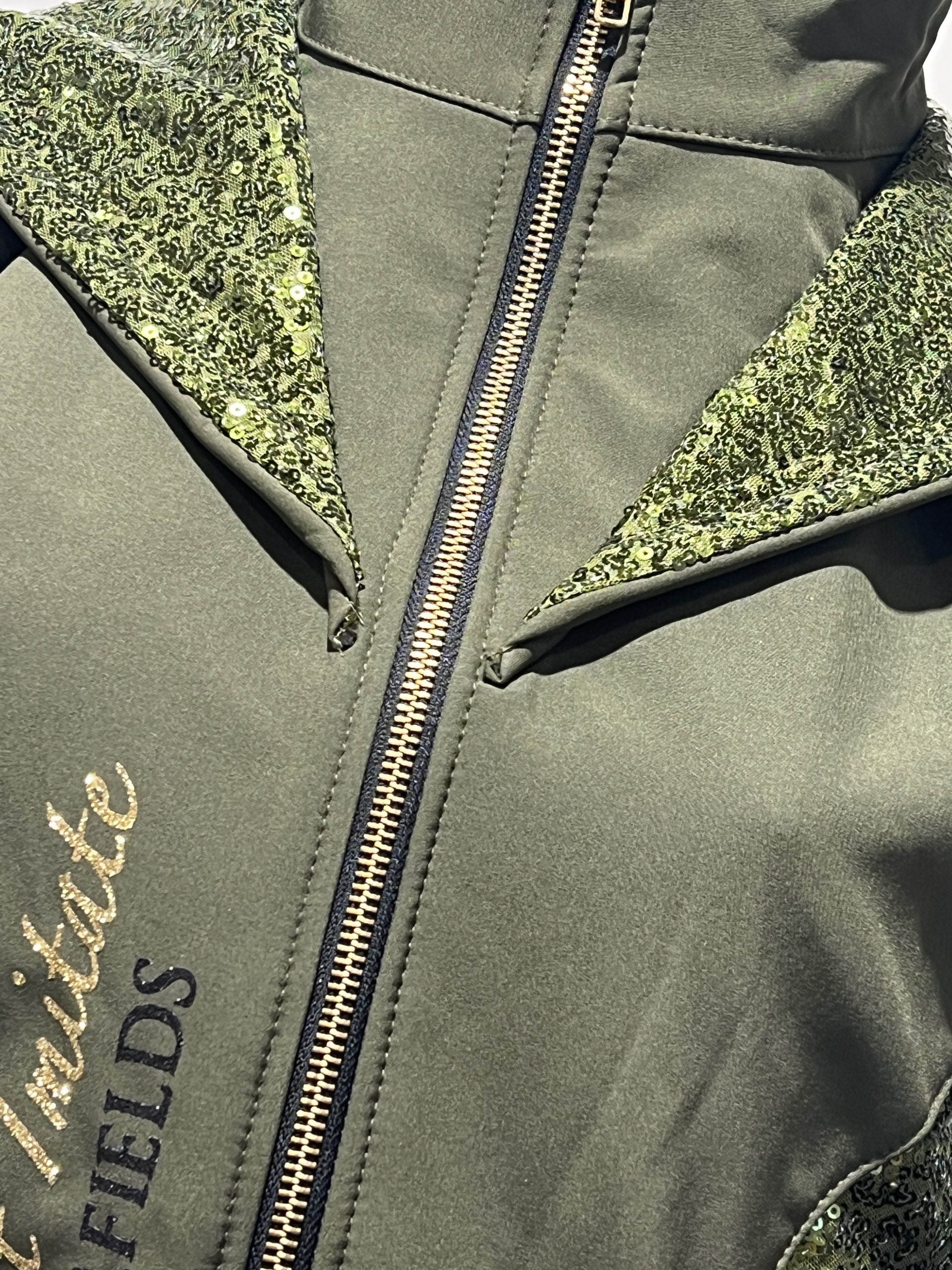 Finished in Olive with full zip and exquisite large hood unique design. Olive sequin details in hood and pockets.