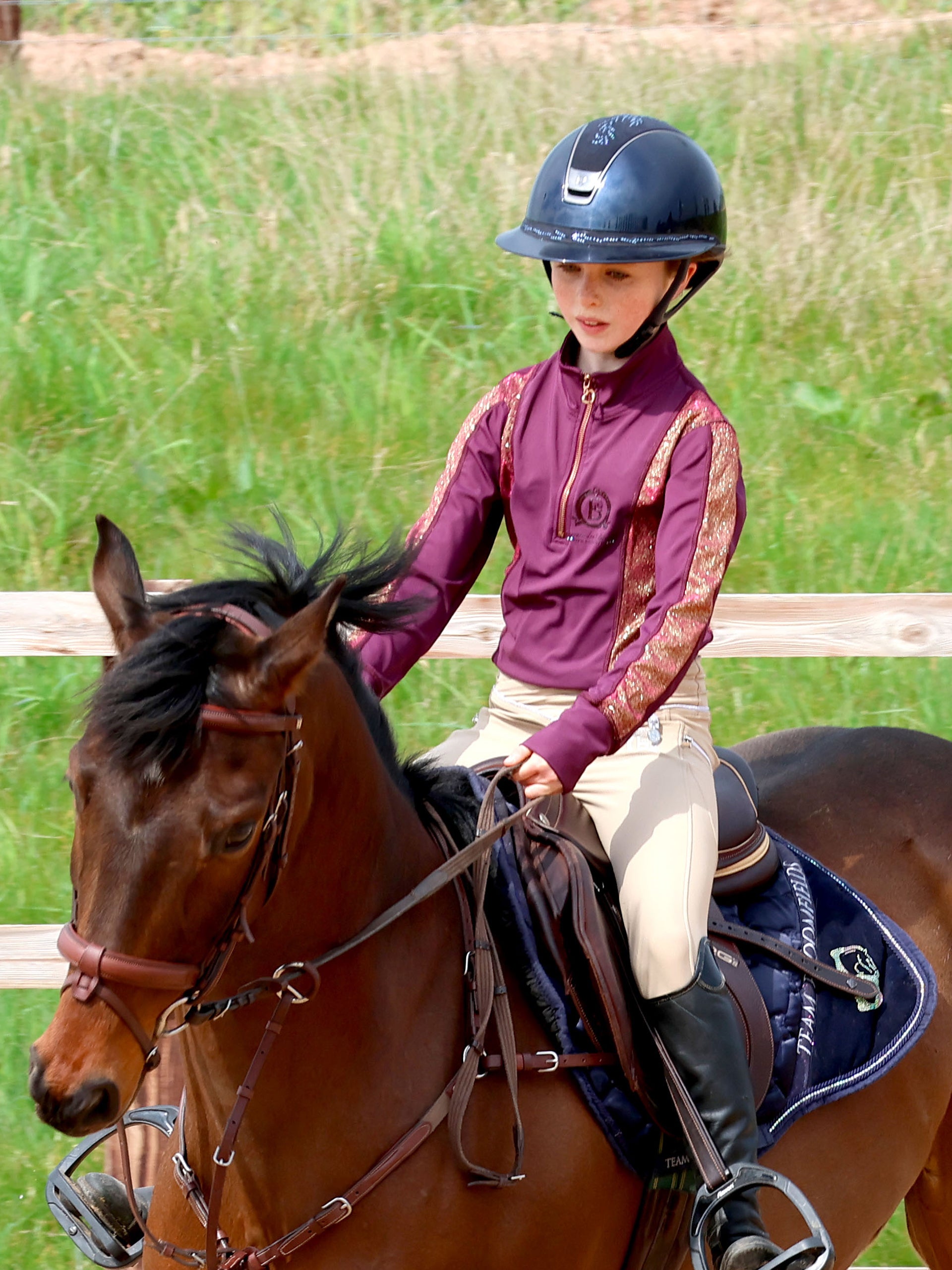 Beautifully fitted mulberry Young Rider base layer with long sleeves