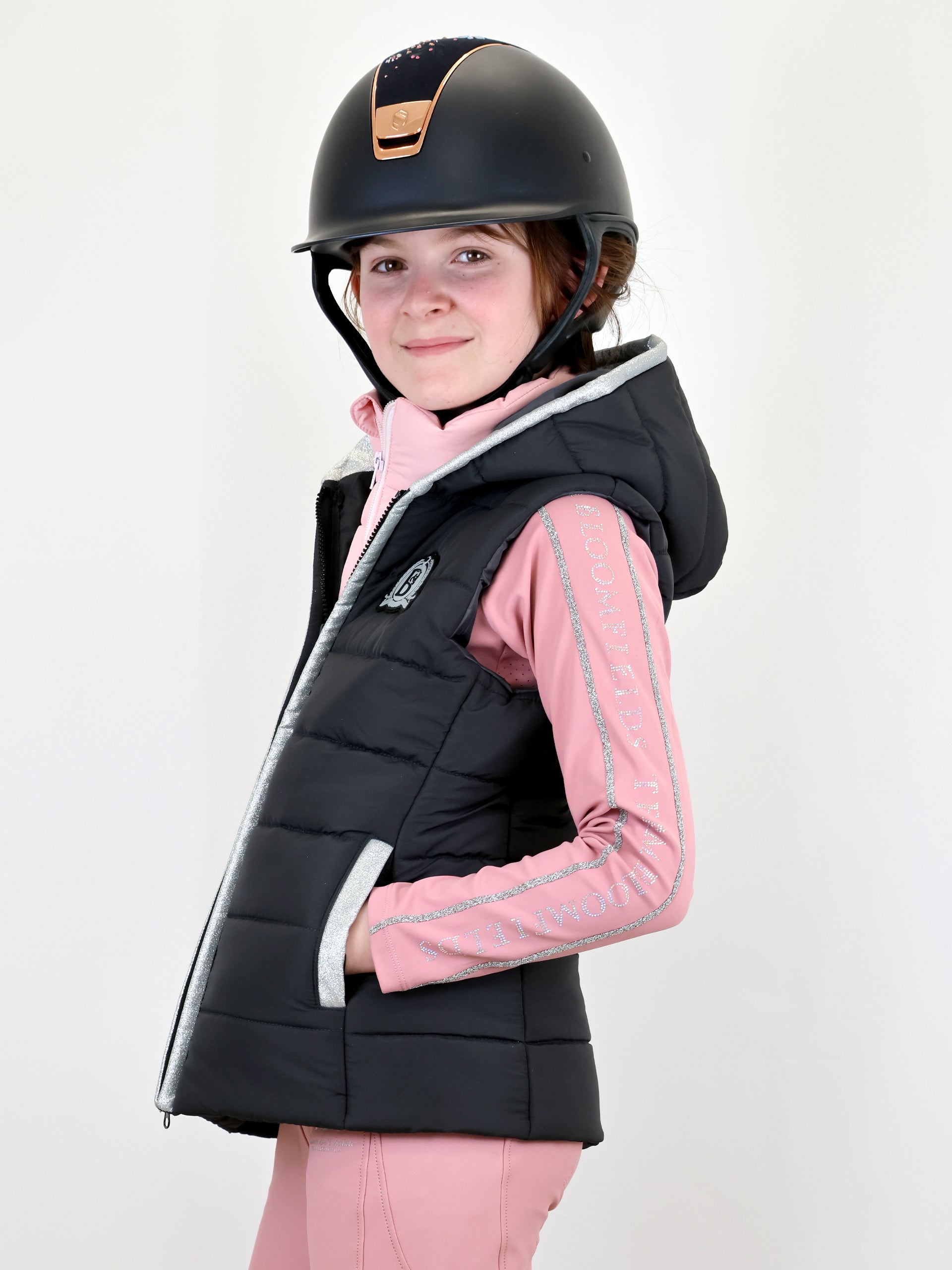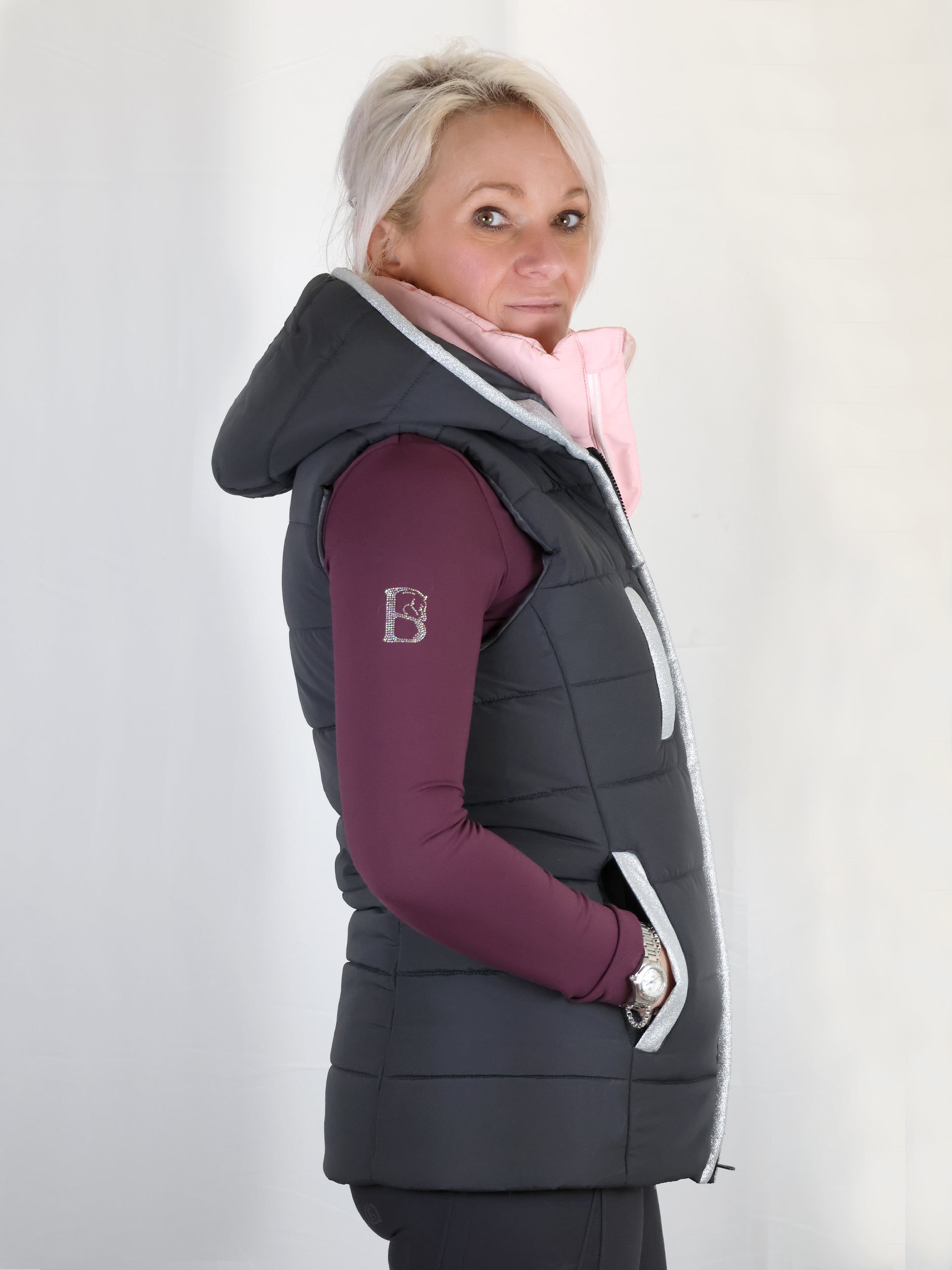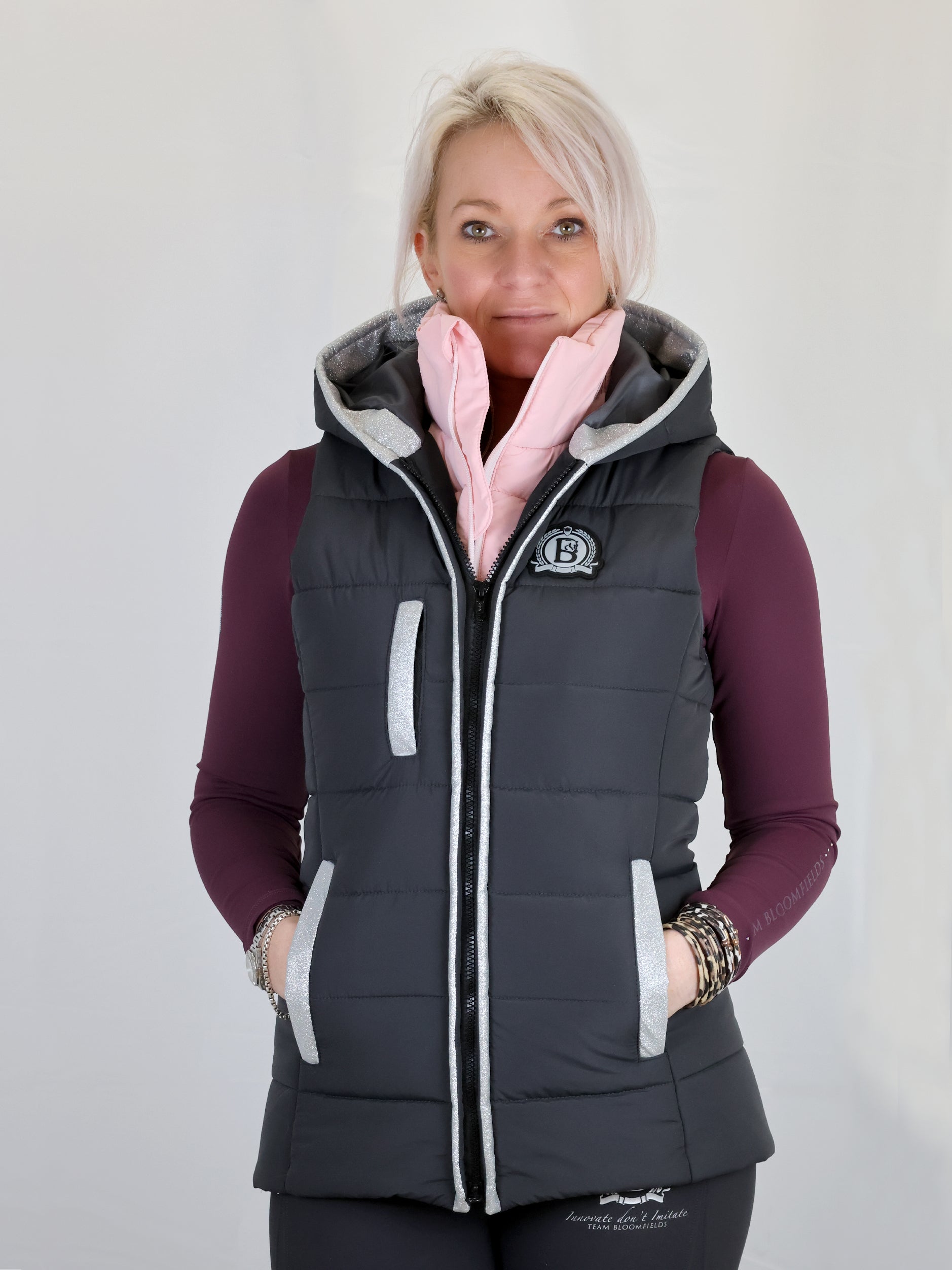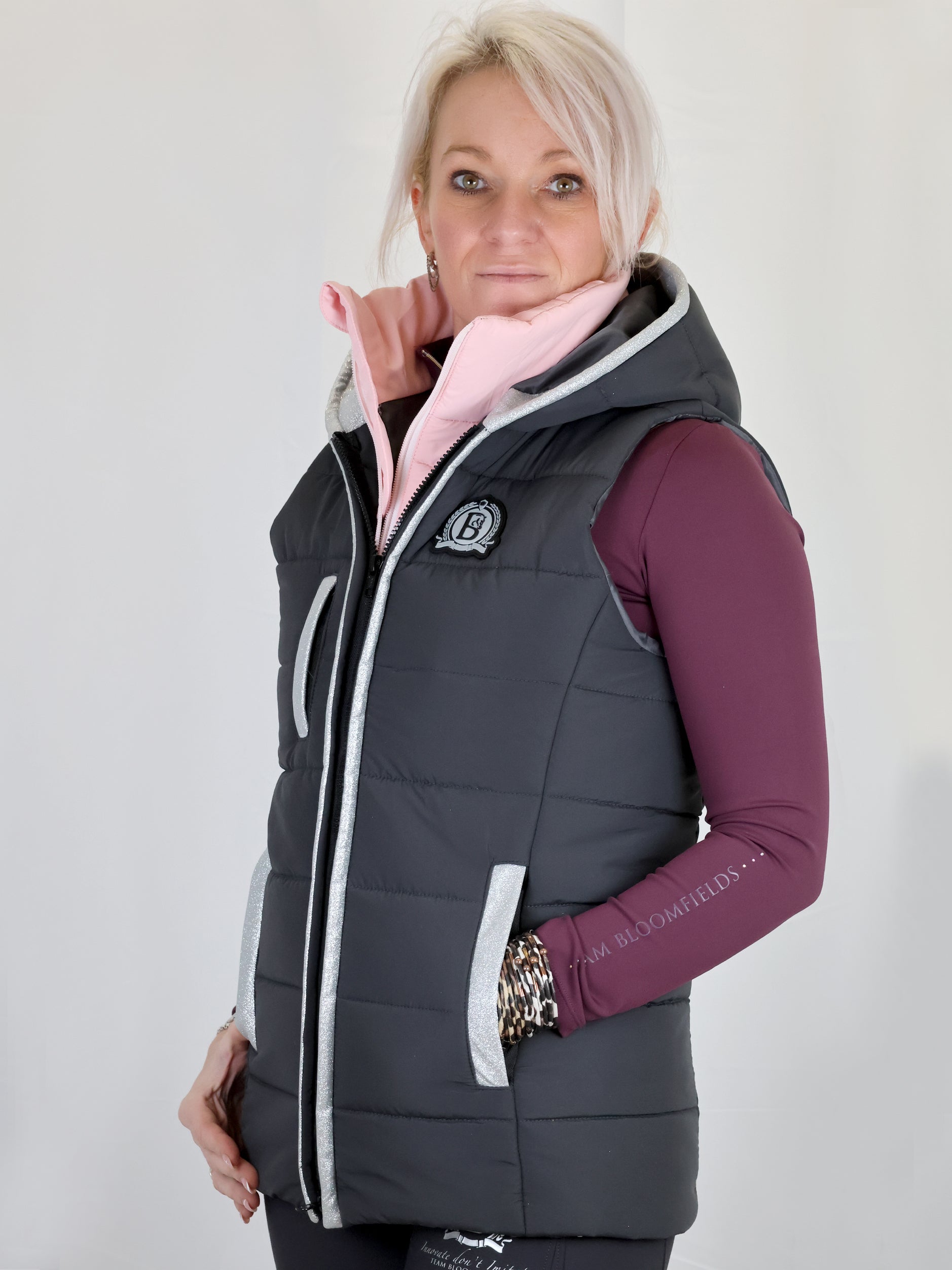 Stay warm and stylish with this beautifully tailored Bloomfields fitted grey gilet. Designed with a double front panel, it provides both a chic layered look and added insulation. The inner pink lining, finished with a subtle glitter panel running up the front and around the pockets, adds a touch of sparkle while keeping the overall aesthetic elegant and sophisticated.