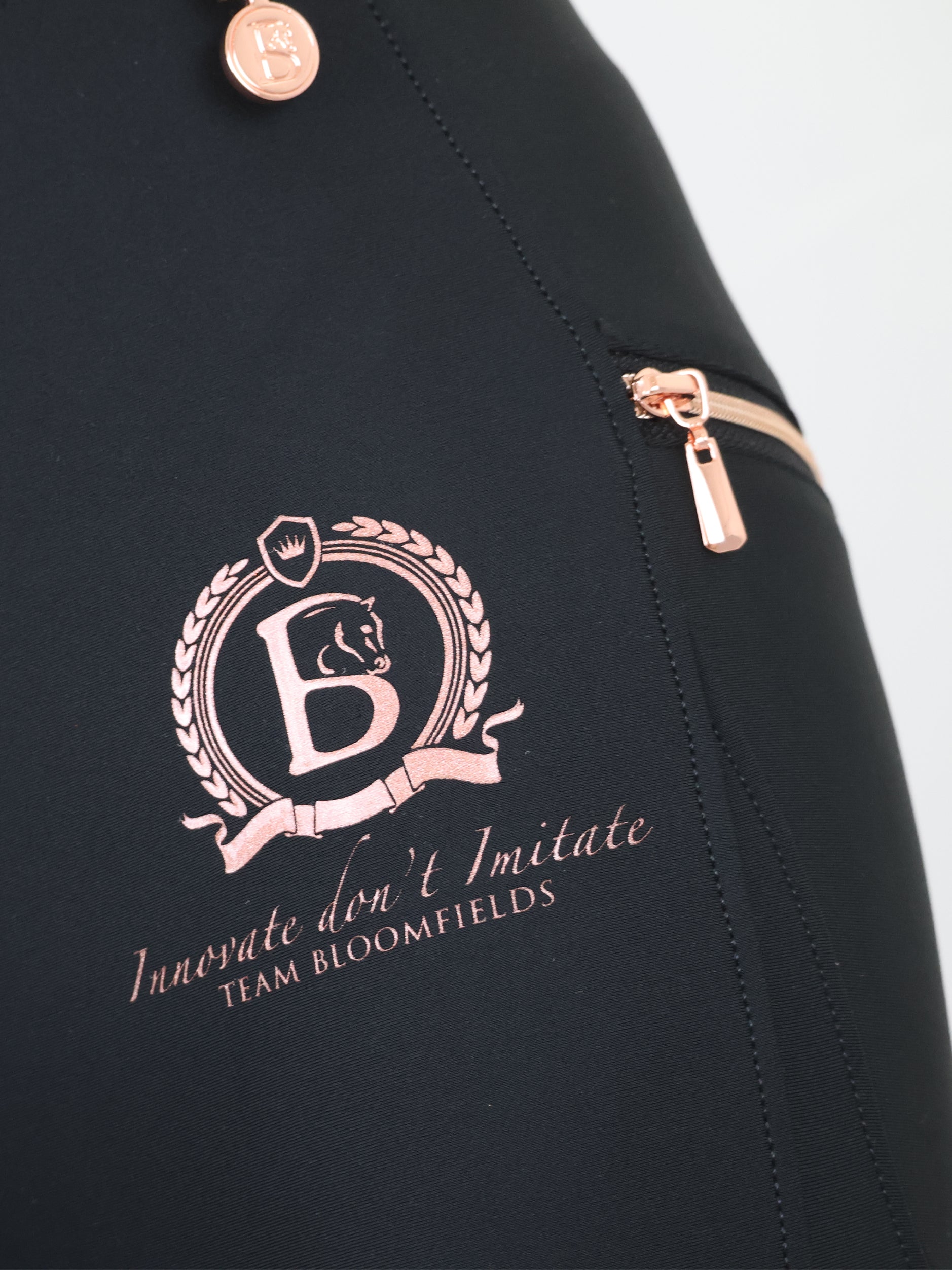 A striking rose gold Bloomfields logo graces the left leg, complemented by a delicate silver charm and subtle diamanté embellishments. Deep, zipped phone pockets blend practicality with opulence.