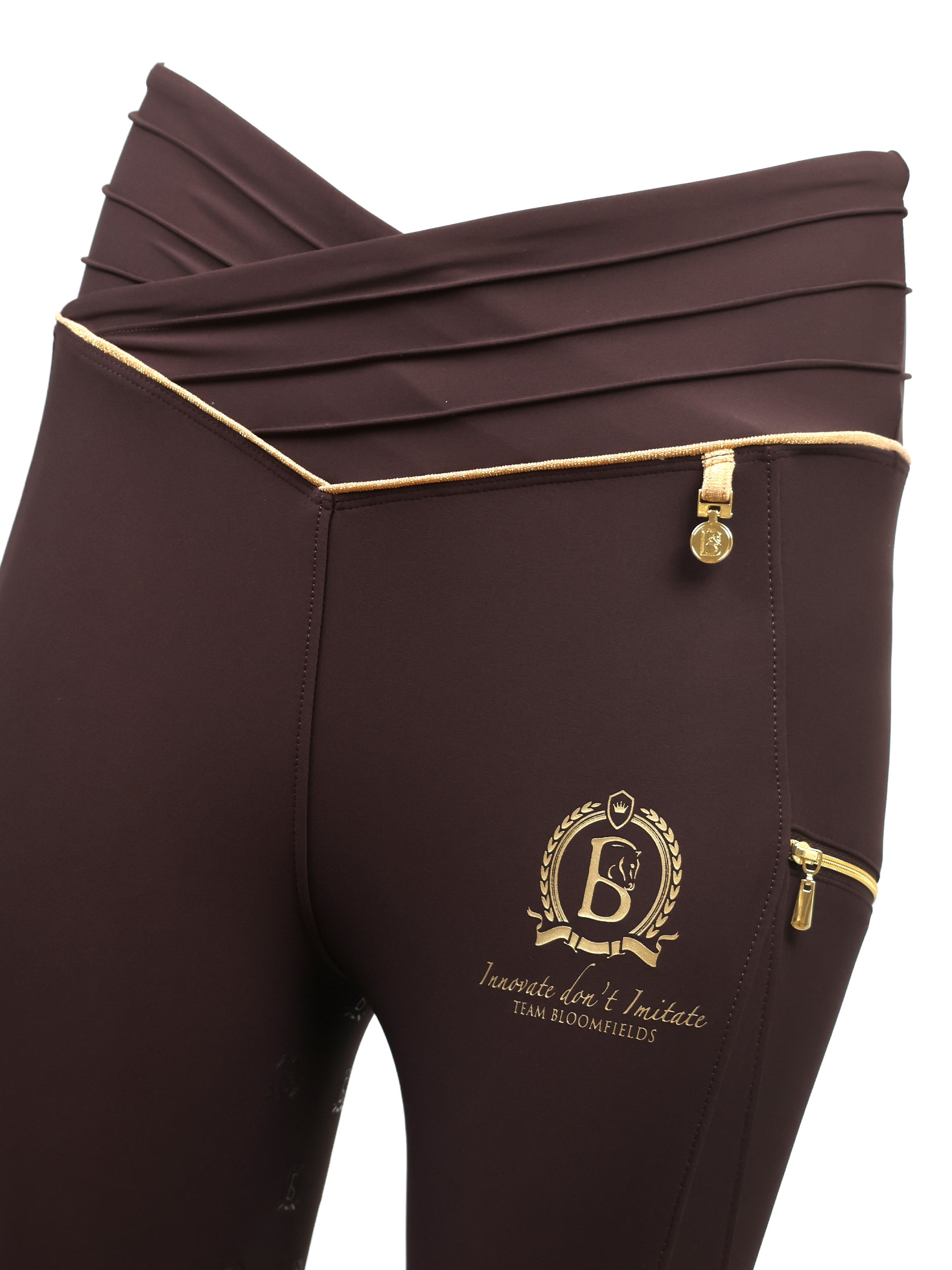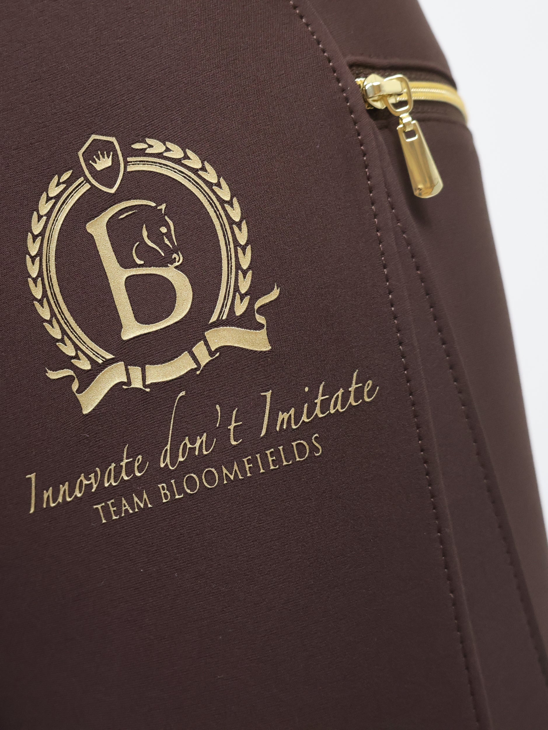 A striking gold Bloomfields logo graces the left leg, complemented by a delicate gold charm and subtle diamanté embellishments. Deep, zipped phone pockets blend practicality with opulence.