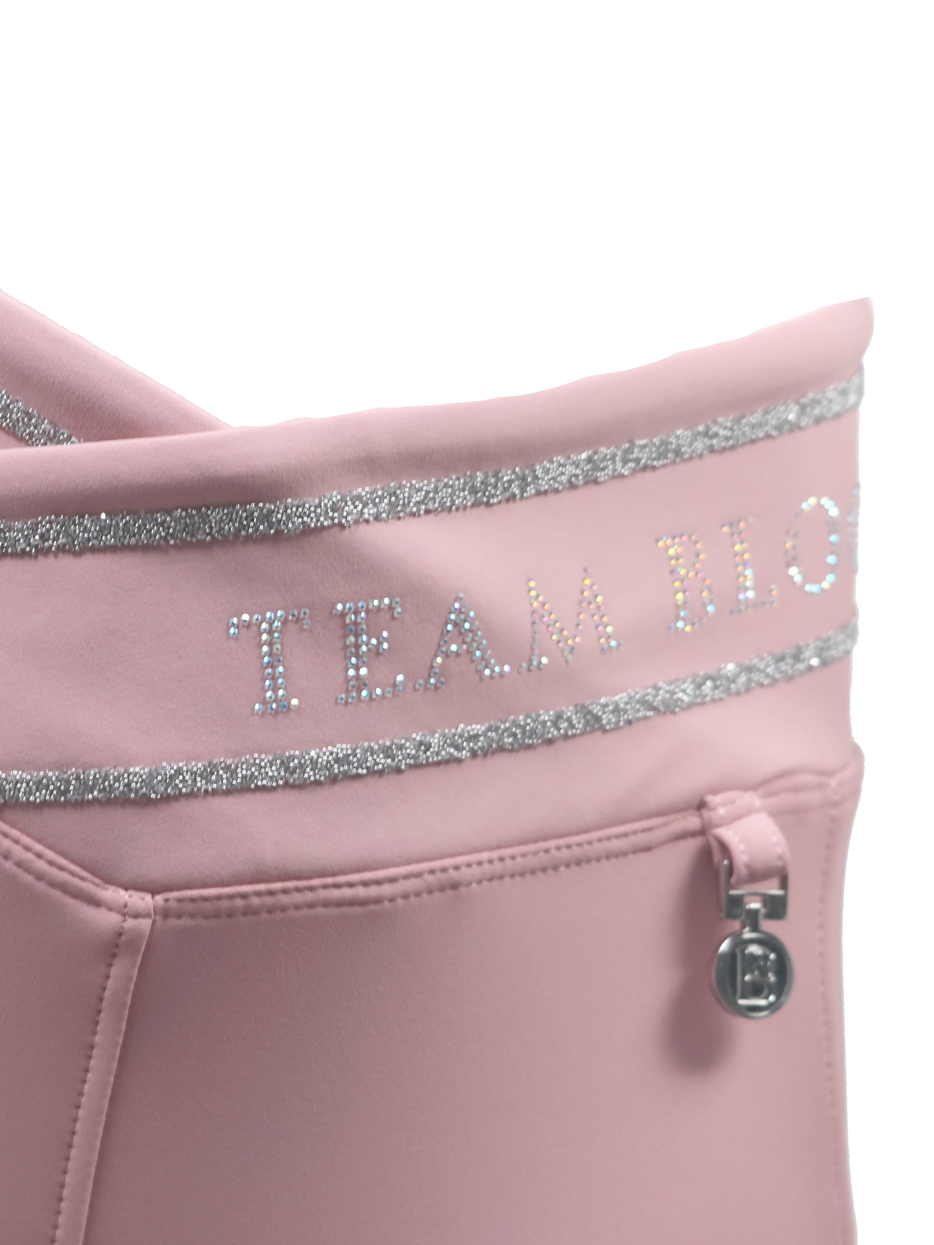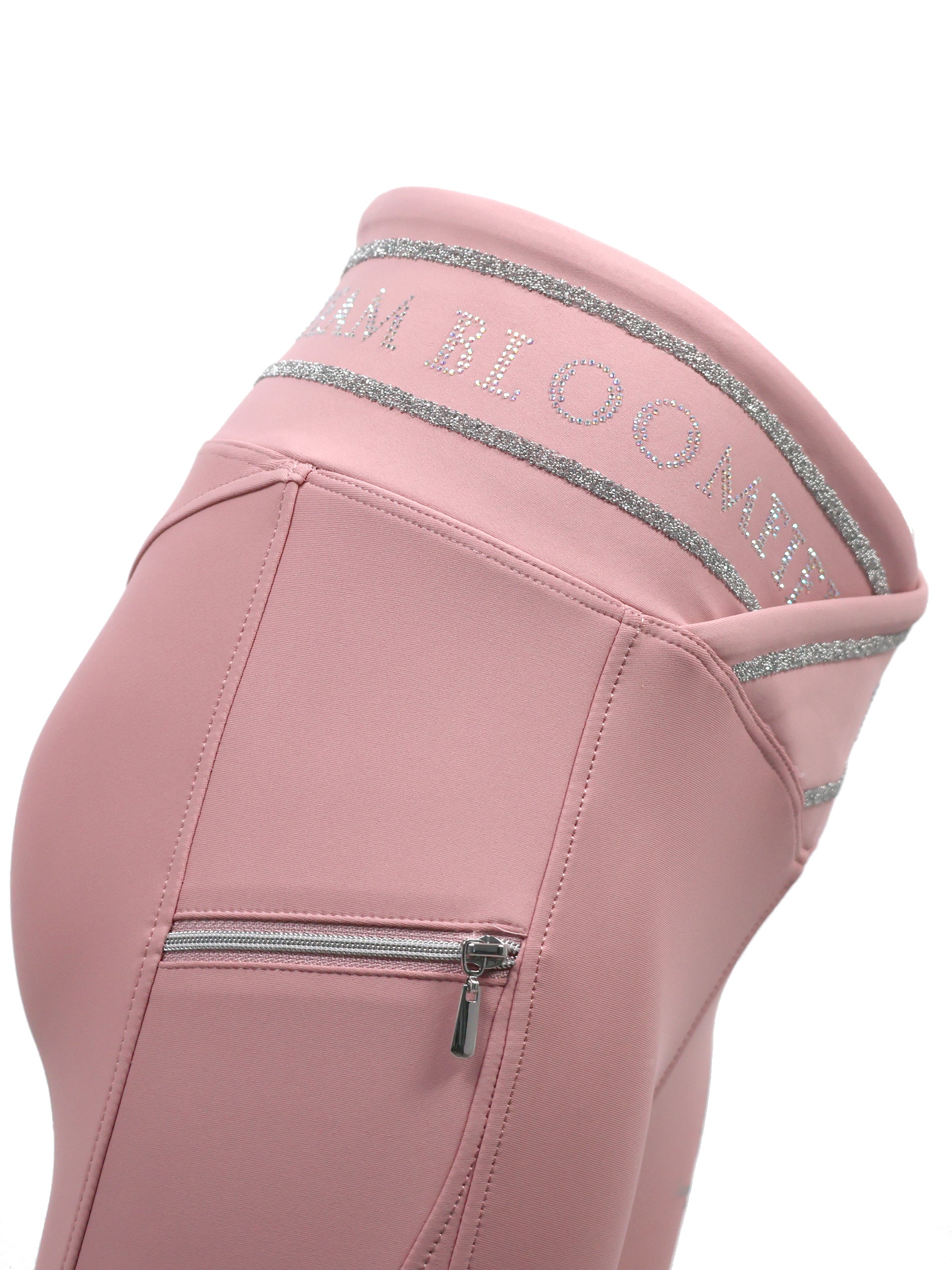 Pink super stretch material with full silicone seat in our Bloomfields crest logo.