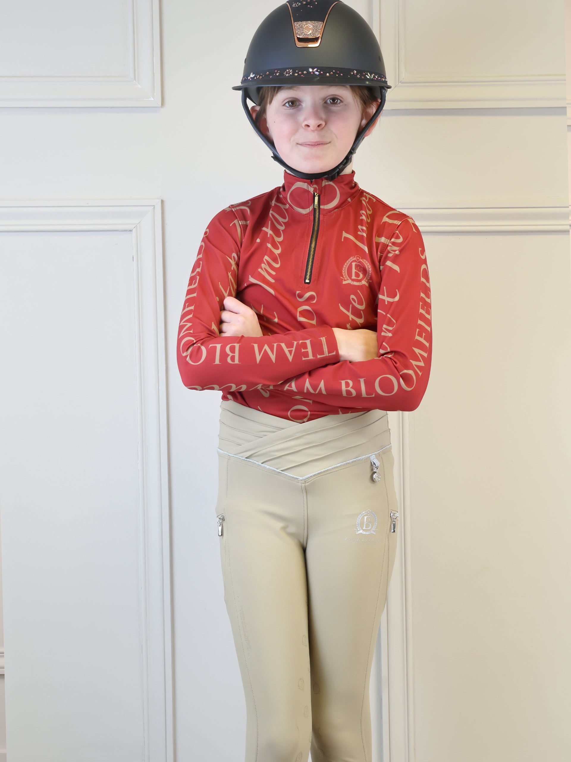Beige super stretch material with full silicone seat in our Bloomfields crest logo