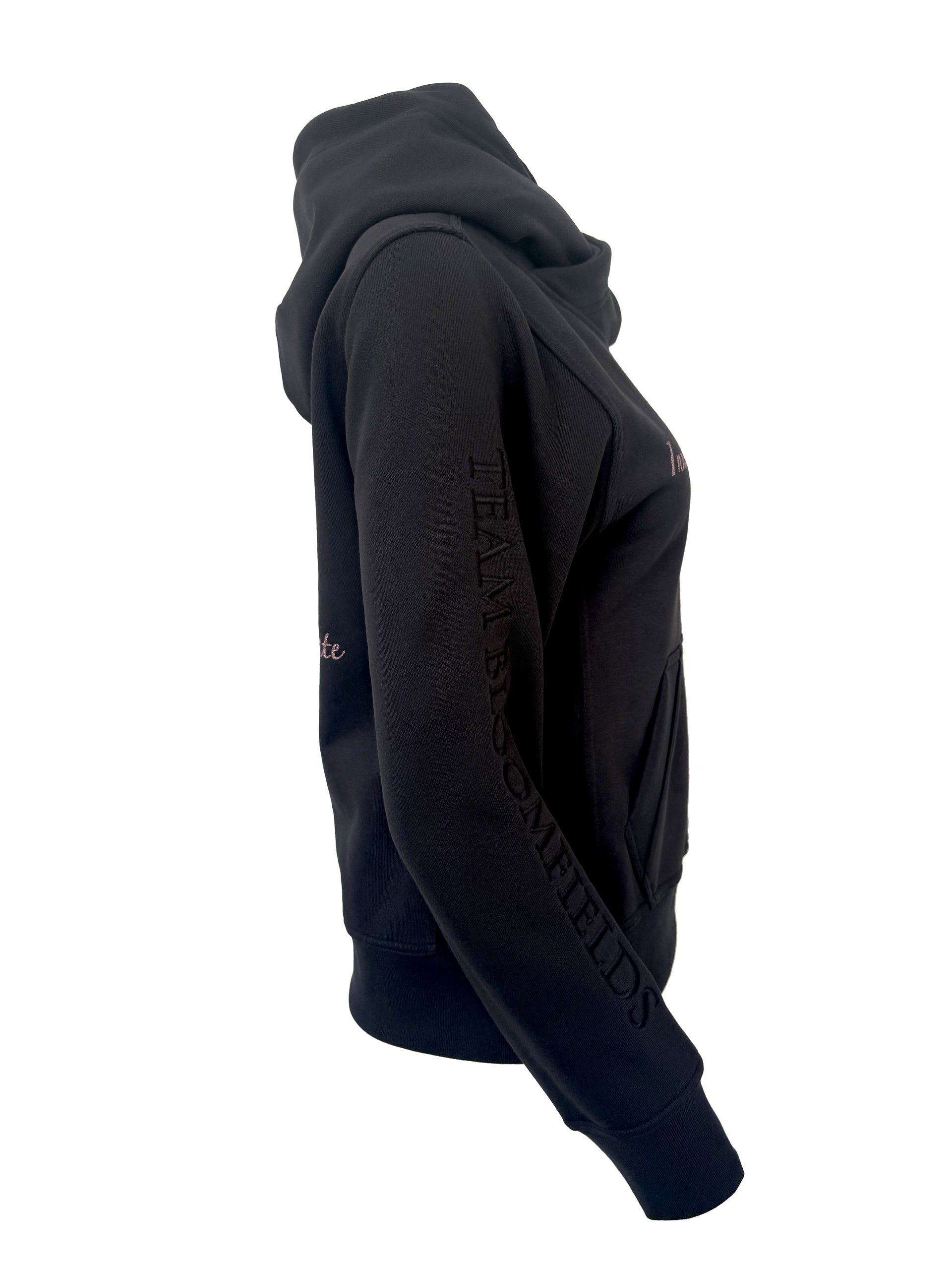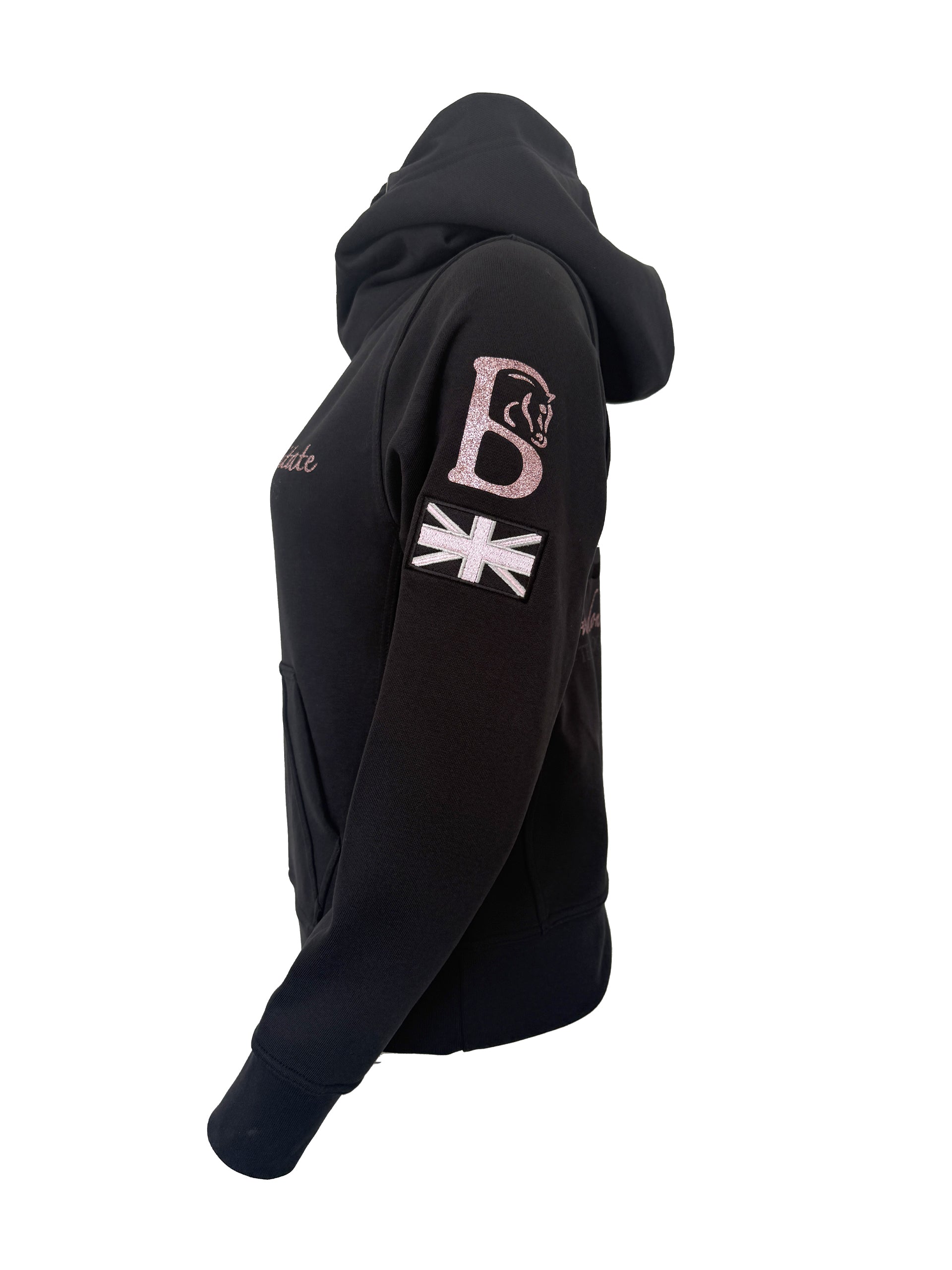 Finished in black with a stylish crossed neck designed hood. Front pockets.