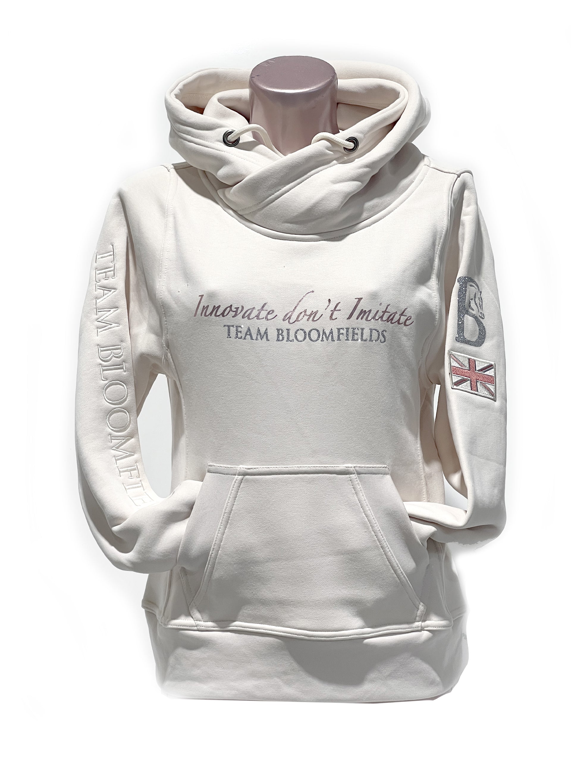 Finished in cream with a stylish crossed neck designed hood. Front pockets.