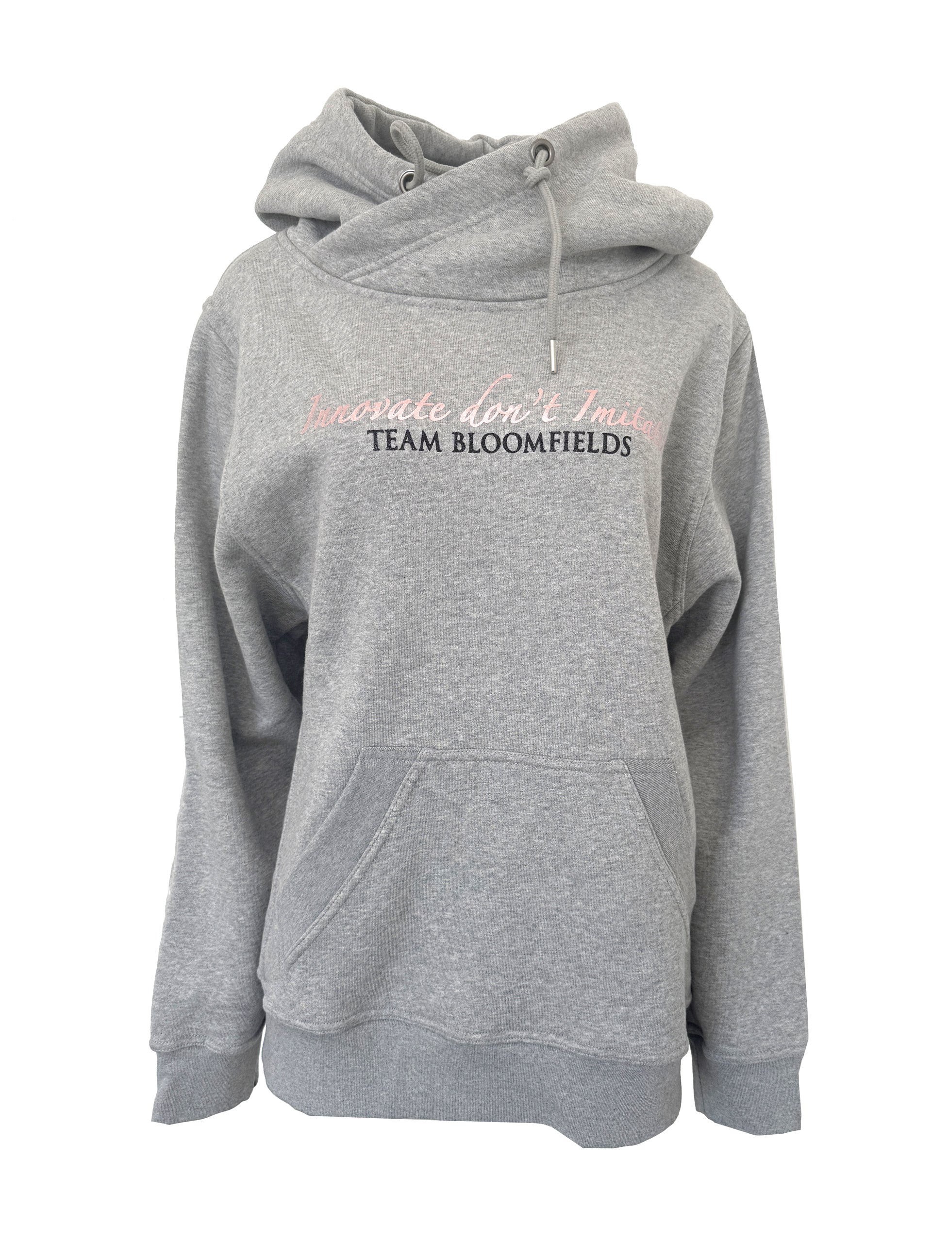 Finished in grey with a stylish crossed neck designed hood. Front pockets.