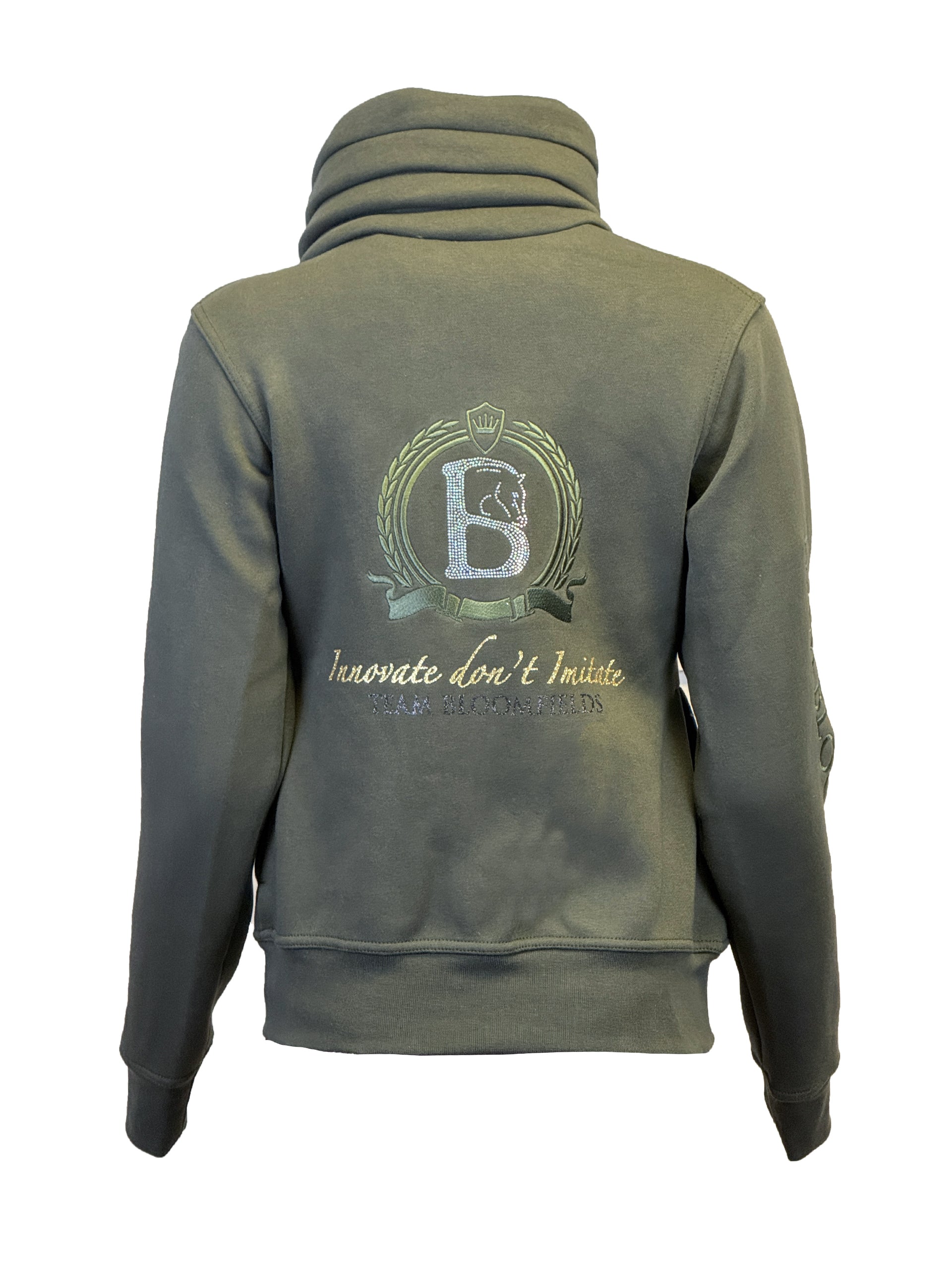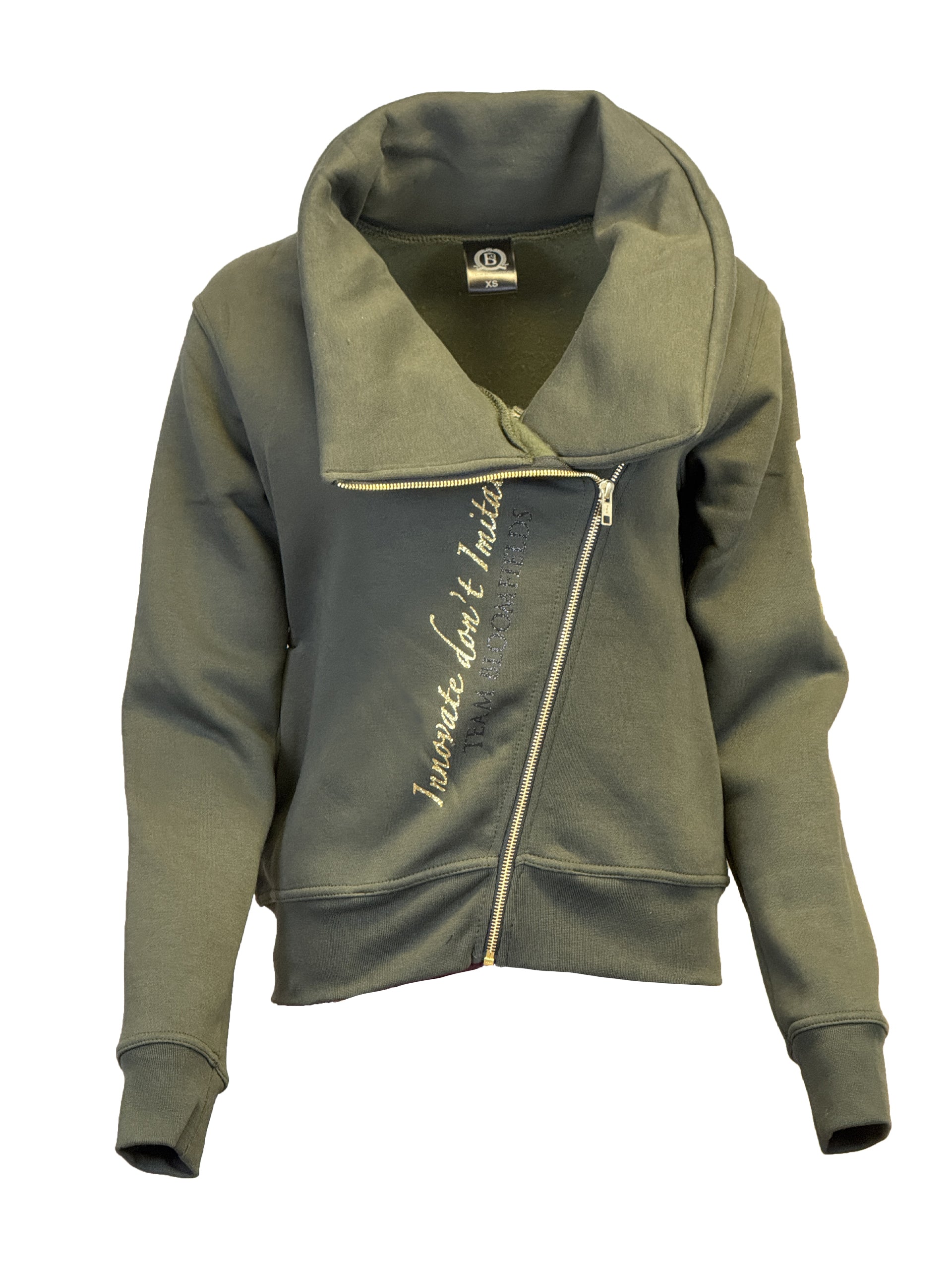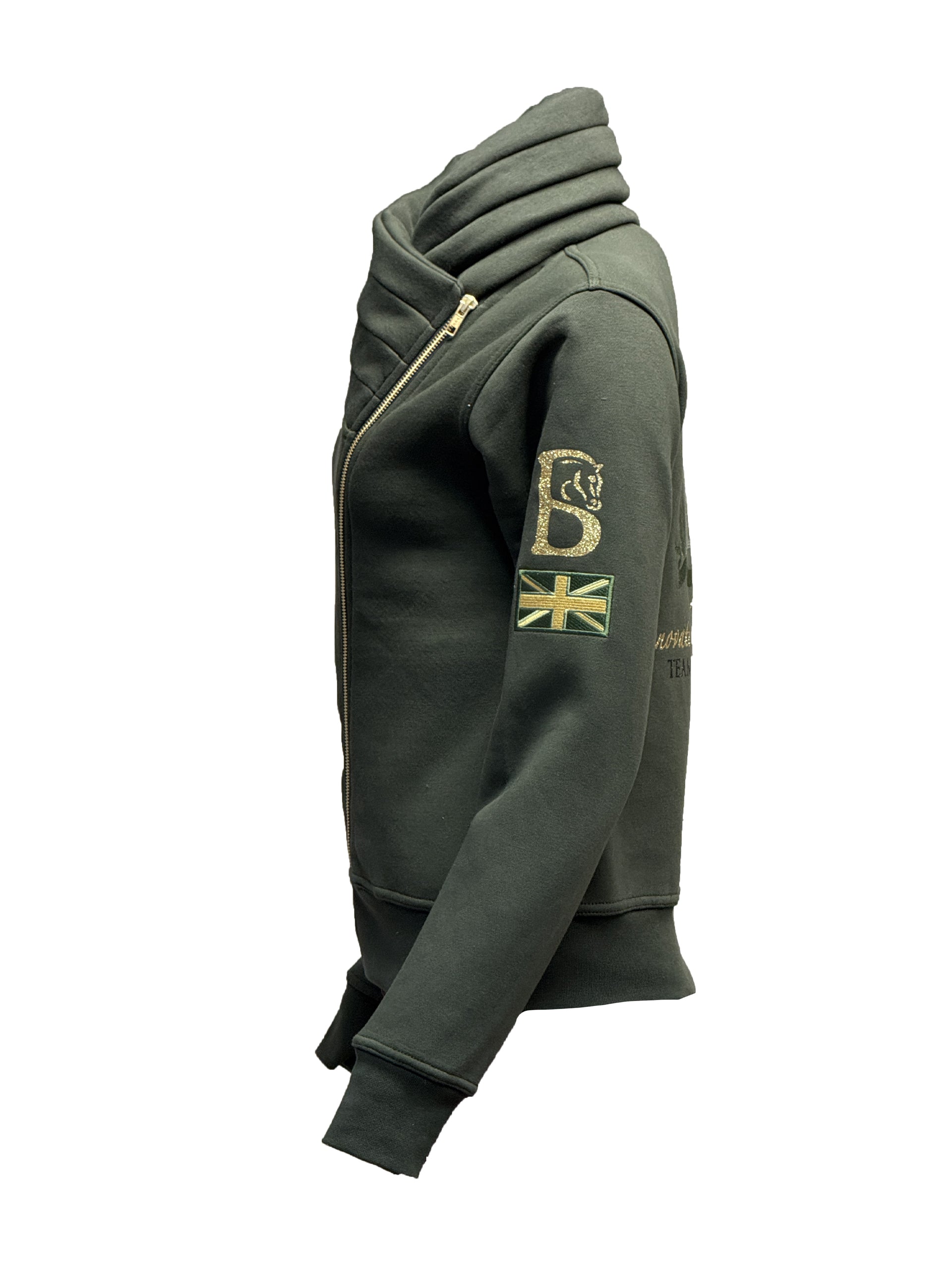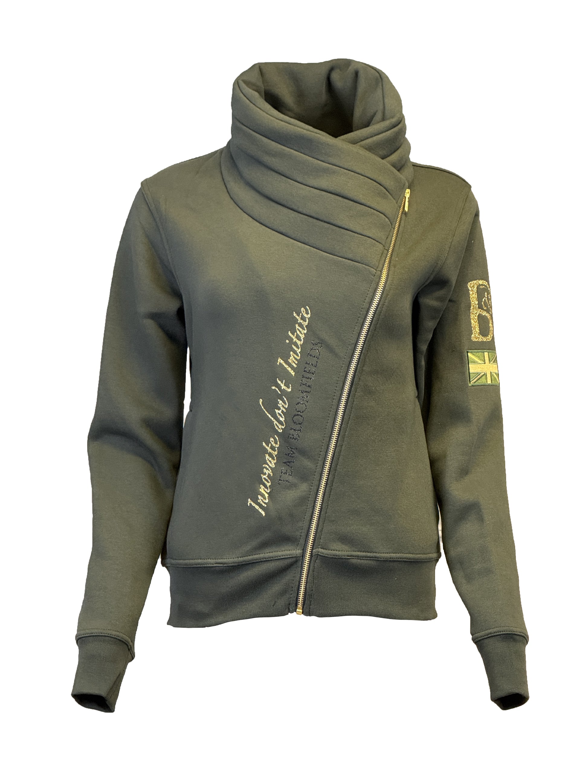 Finished in olive with gold with full zip and exquisite high neck unique design.