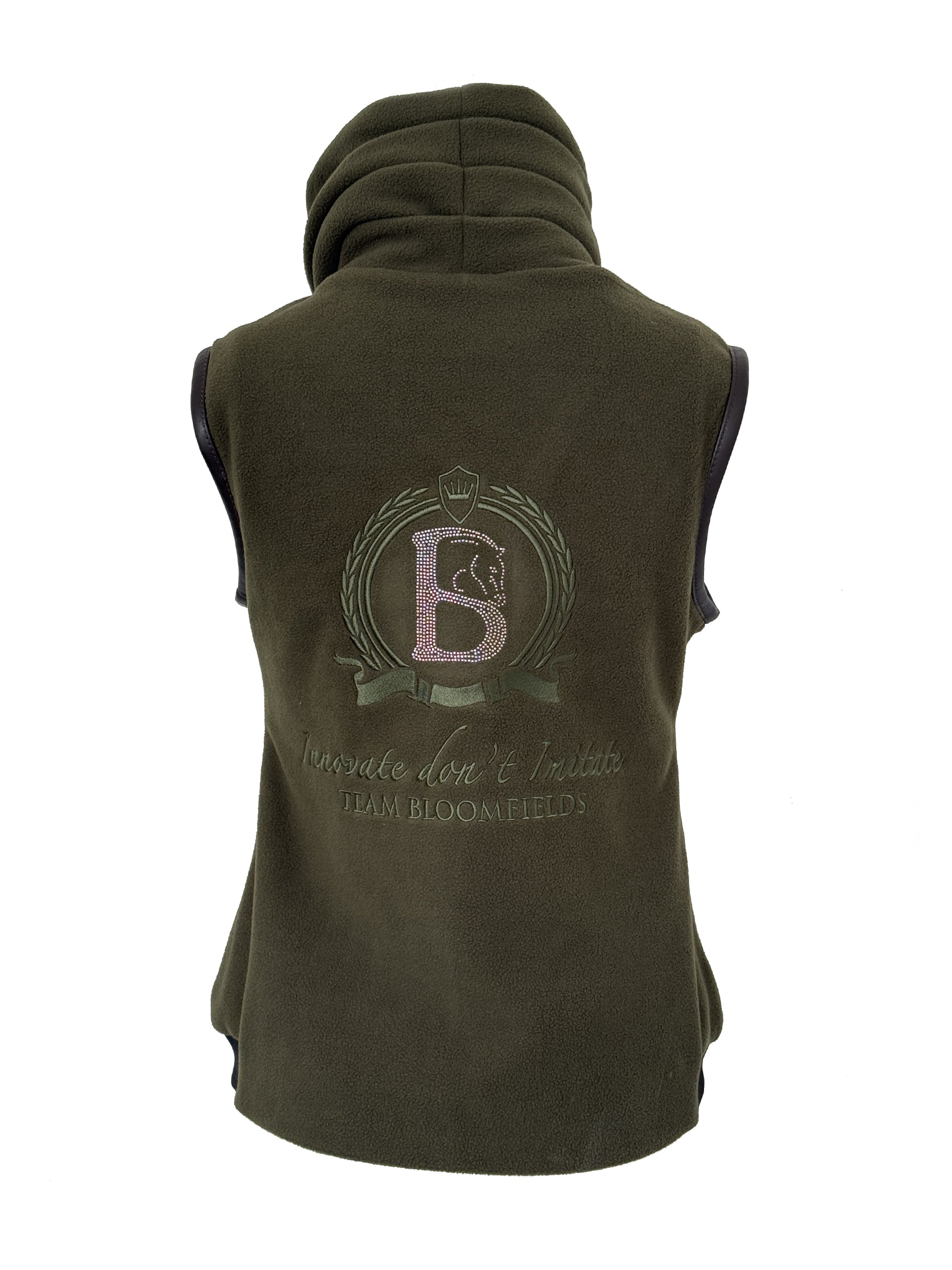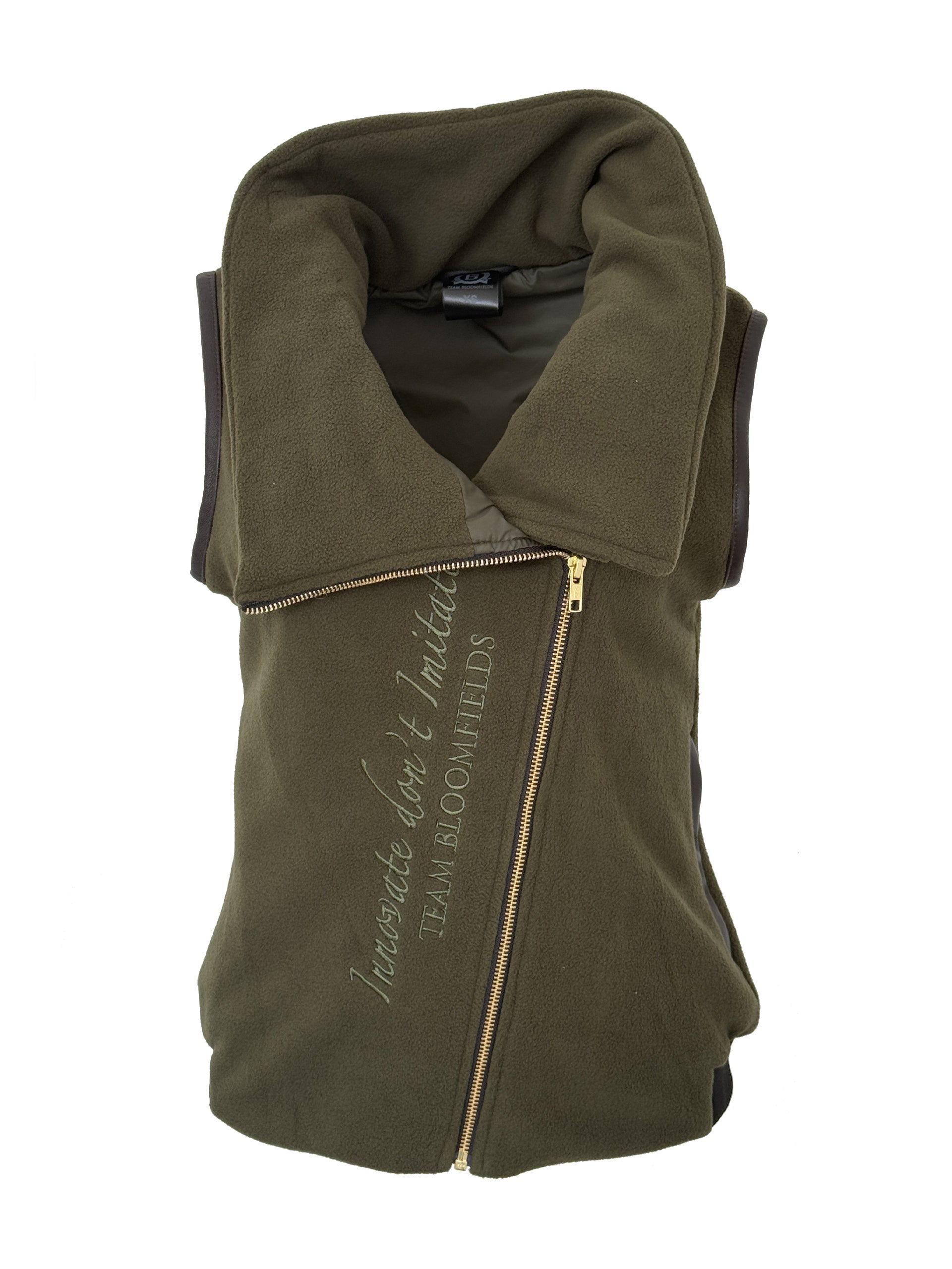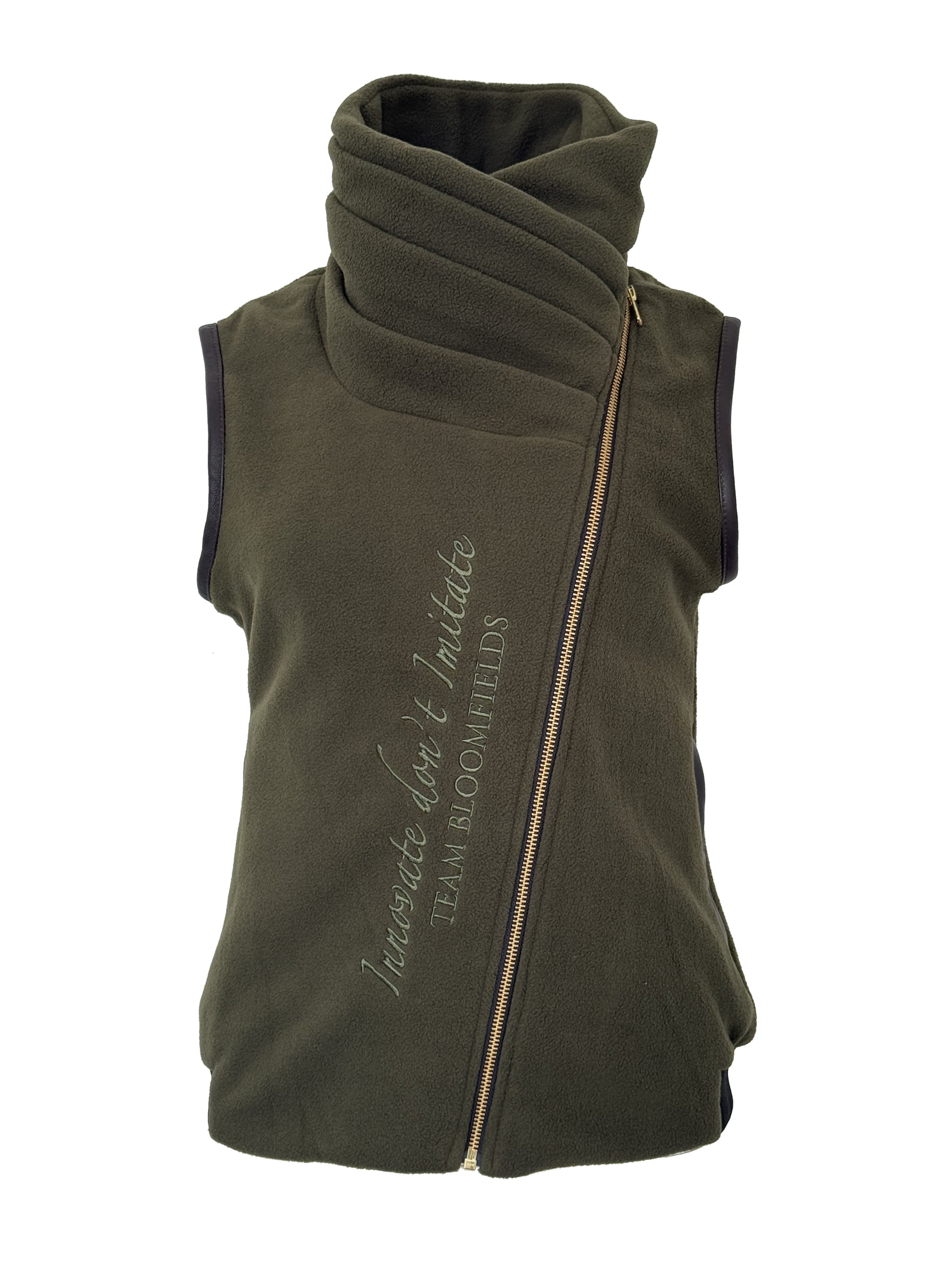 Olive country fleece gilet, with our best selling Sabrina ruffled high neck line