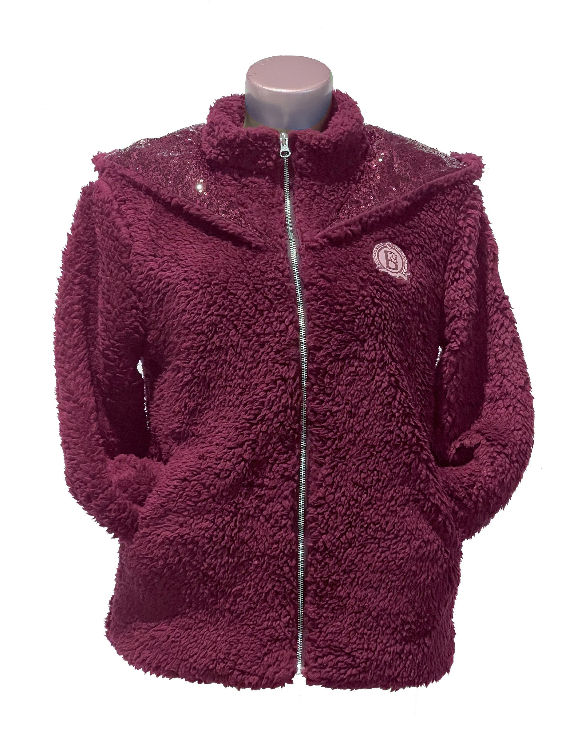 Finished in burgundy with full zip and exquisite large hood unique design. Burgundy sequin details in hood and pockets.