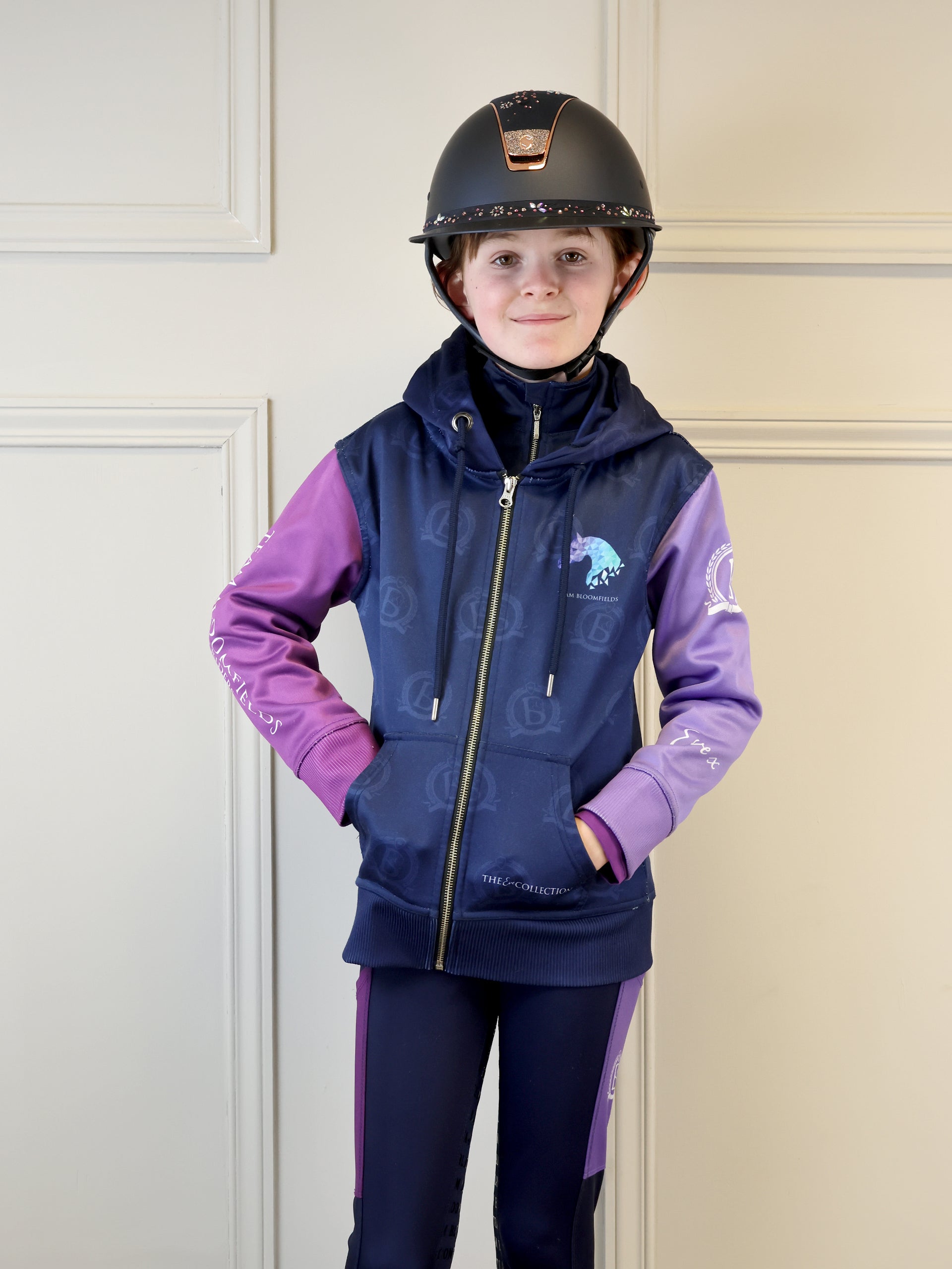 Finished in navy with zip and hood unique design. contrasting arm colour